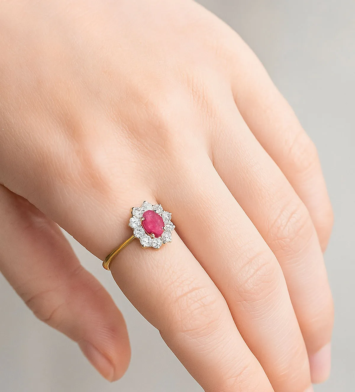 Existen joyas que trascienden las tendencias, y este anillo es un claro ejemplo. Su diseño refinado, compuesto por un rubí oval de 7×5 mm y rodeado por diez circonitas engastadas de forma individual, crea un efecto luminoso que resalta la belleza de la piedra central. Un modelo que siempre resulta indicado, sea cual sea la ocasión.