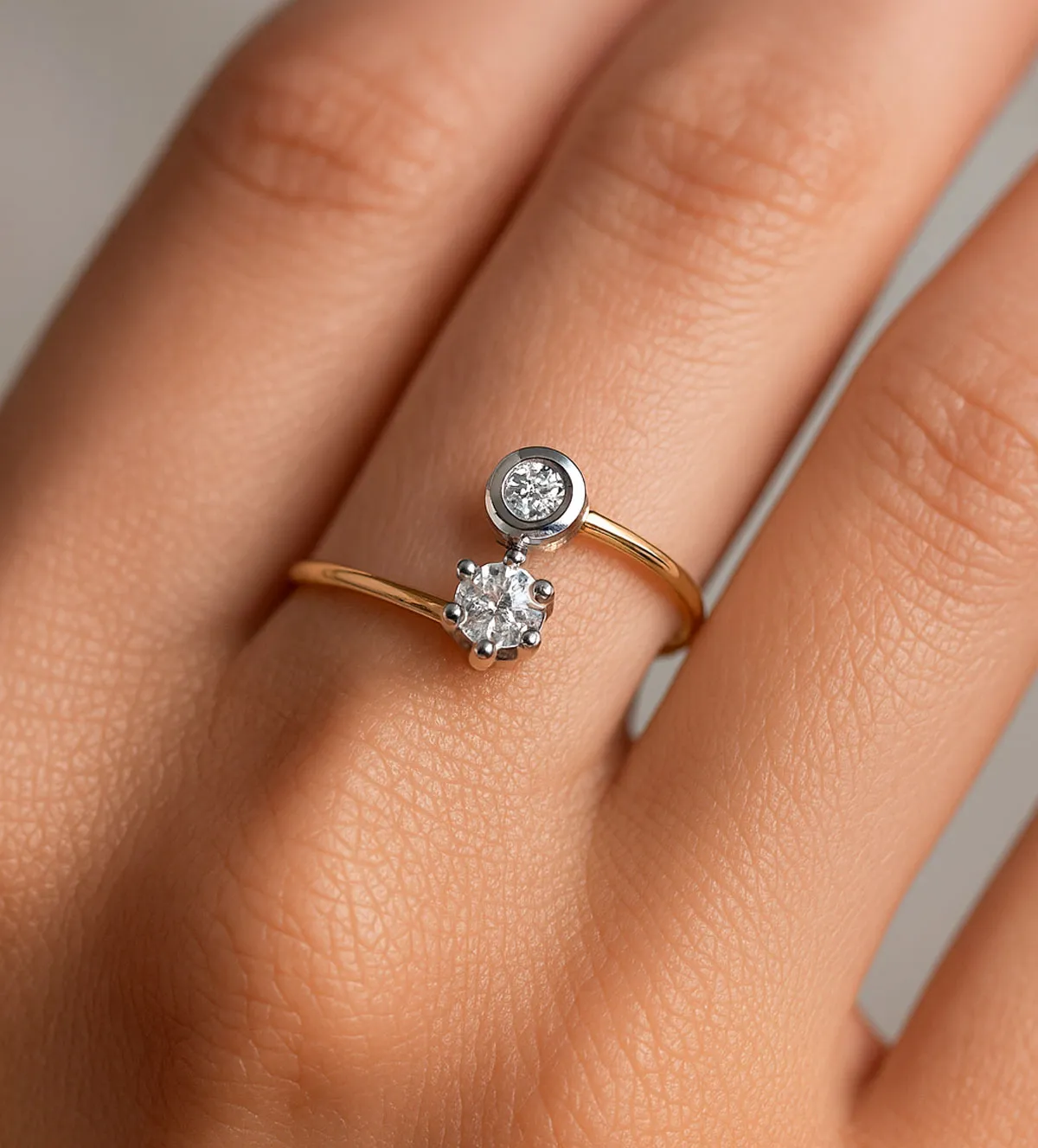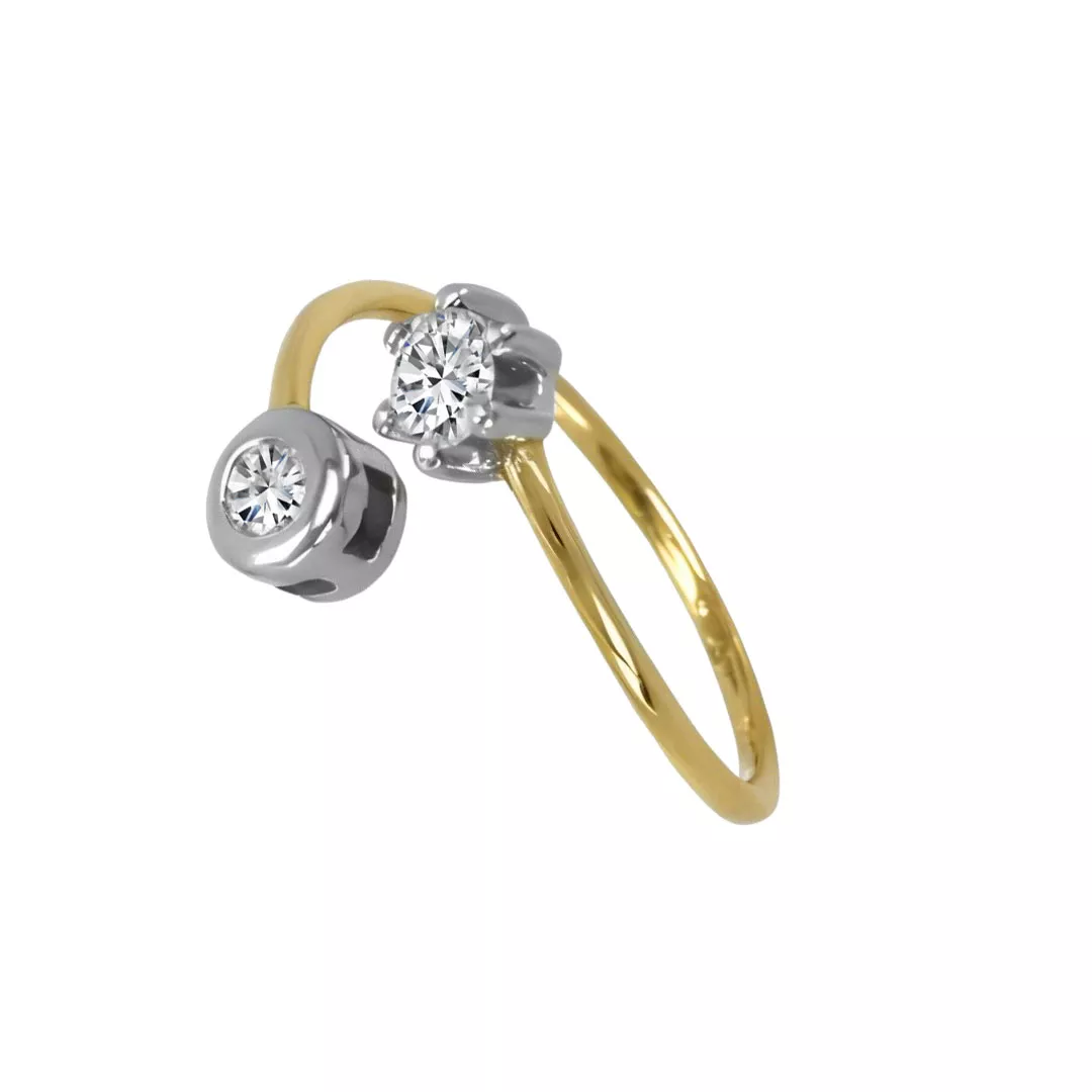 El anillo de oro bicolor 18 quilates “Danza de Luz” es una pieza elegante y moderna que combina dos circonitas engastadas en garra y chatón. Su diseño abierto, con brazo de oro amarillo y detalles en oro blanco, crea un efecto visual encantador y sofisticado, ideal para cualquier look. Esta joya única, perfecta para ocasiones especiales o uso diario, está disponible en stock con entrega inmediata.
