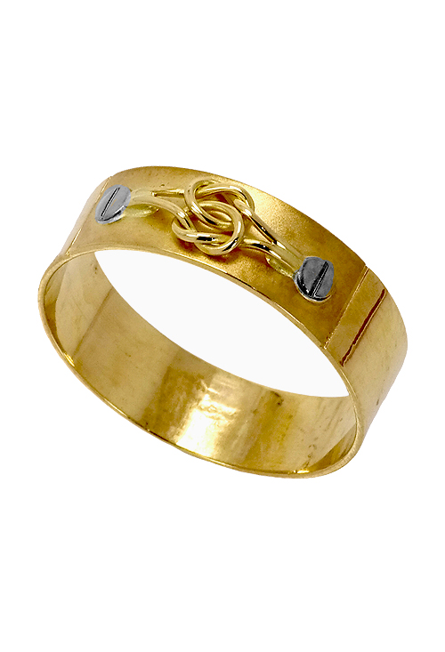 Anillo de oro para mujer bicolor de 18 kilates banda recta matizada de 5,50 milímetros de ancho con adorno de nudo marinero. en su parte frontal, esta sortija pesa 2,70 gramos.