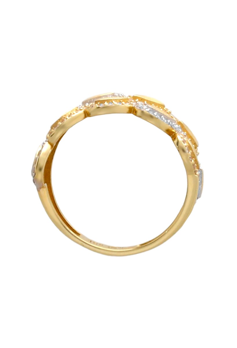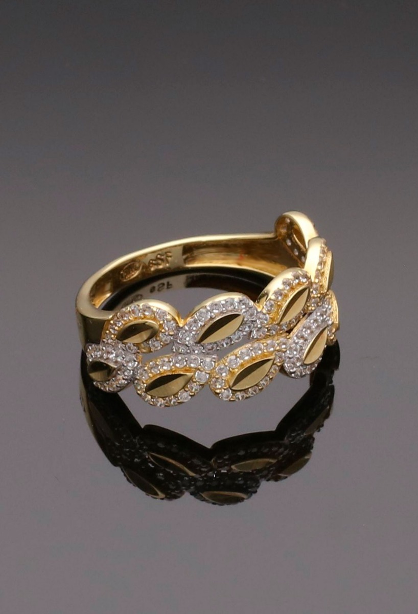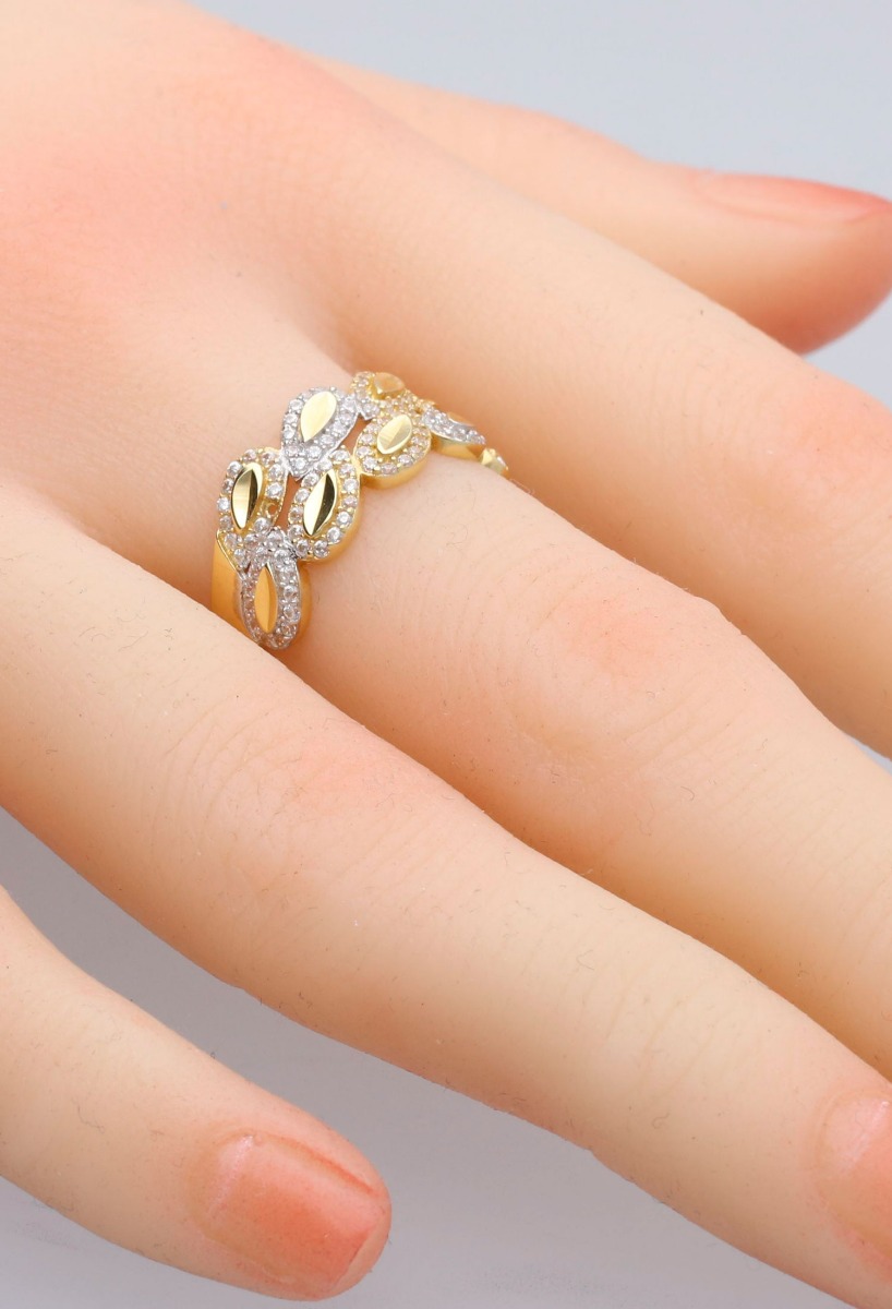 Anillo de mujer realizado con oro amarillo de primera ley 18 kilates, frontis de doble fila paralelas entre sí formadas por formas ojivales con orlas de circonitas, unas rodinadas en blanco y otras no, es un modelo diferente muy poco visto que te resultará fácll de llevar y muy fácil de combinar, además estarás encantada de poder lucir en todo tipo de ocasiones.