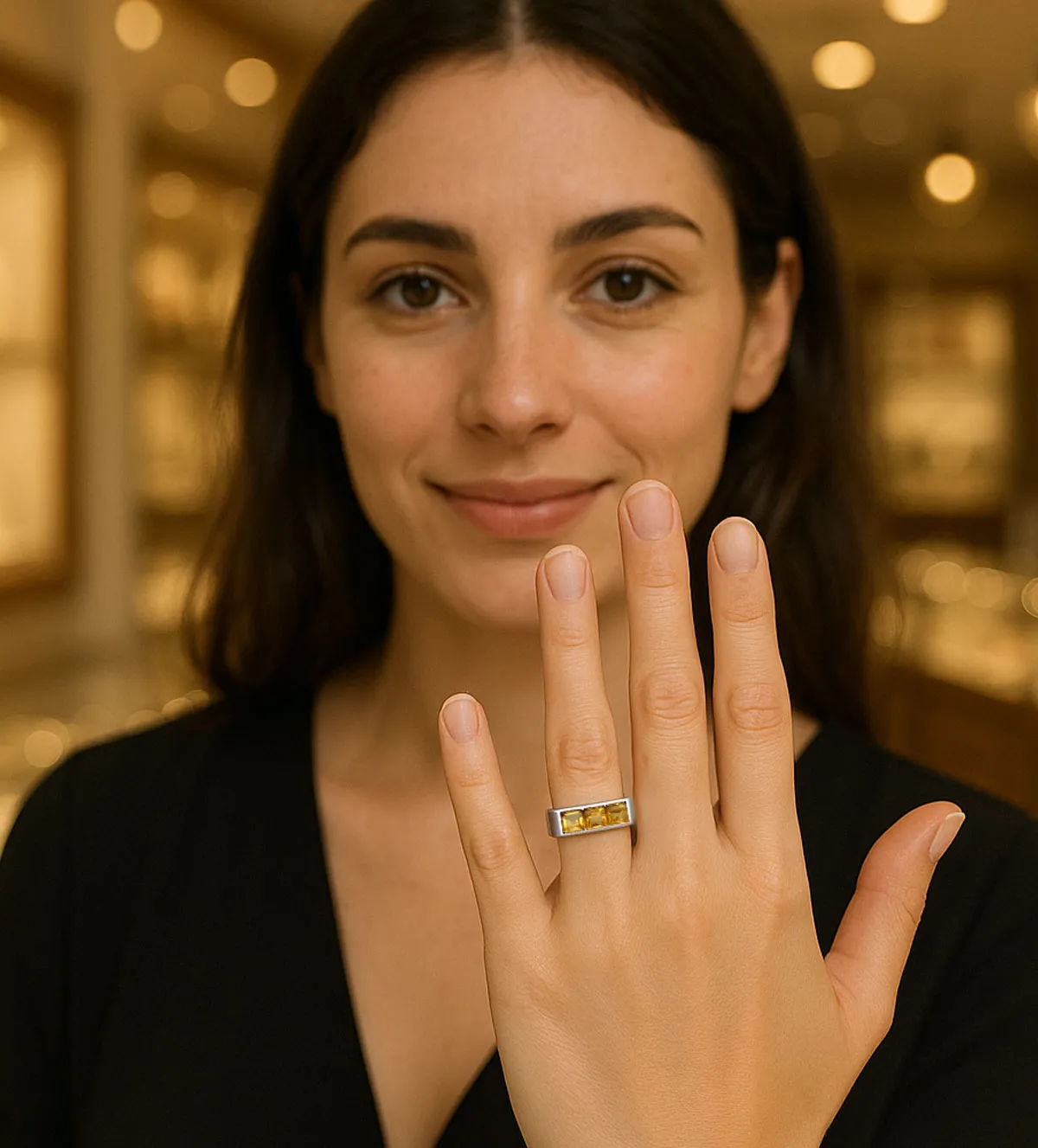 Los tres citrinos talla carré han sido seleccionados por su claridad, color uniforme y corte preciso, que realzan su brillo natural. El engaste en bisel dentro de un carril asegura protección y durabilidad, sin sacrificar estética.