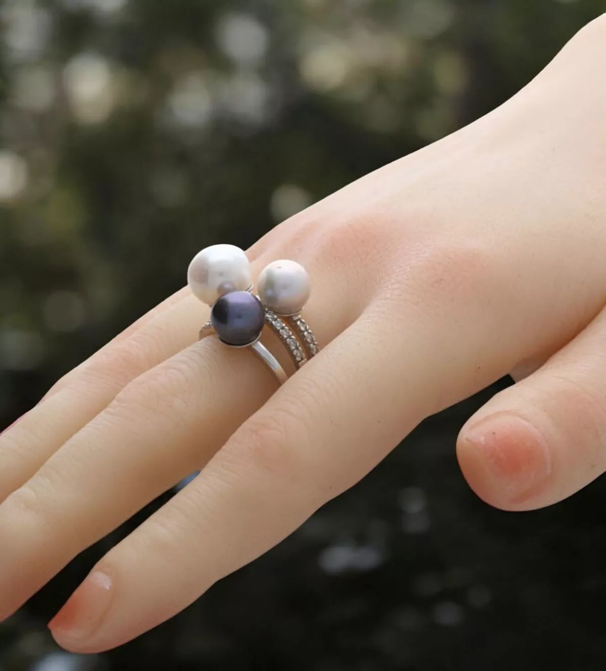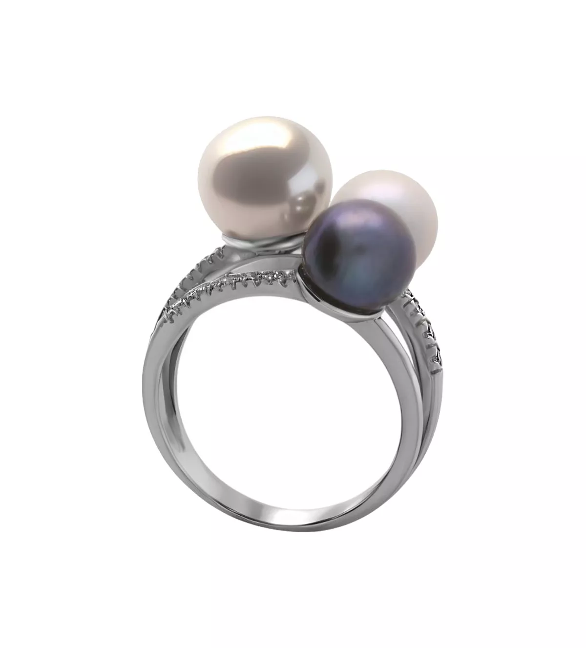 Este anillo está elaborado con oro blanco de ley de 18 kilates, garantizando resistencia y durabilidad. Las tres perlas cultivadas, en tonos blanco, gris y rosa, son seleccionadas cuidadosamente para lograr una armonía perfecta en color y tamaño. Los diamantes, con un peso total de 0,12 quilates, destacan por su corte brillante y claridad, maximizando su destello al captar la luz desde cualquier ángulo.