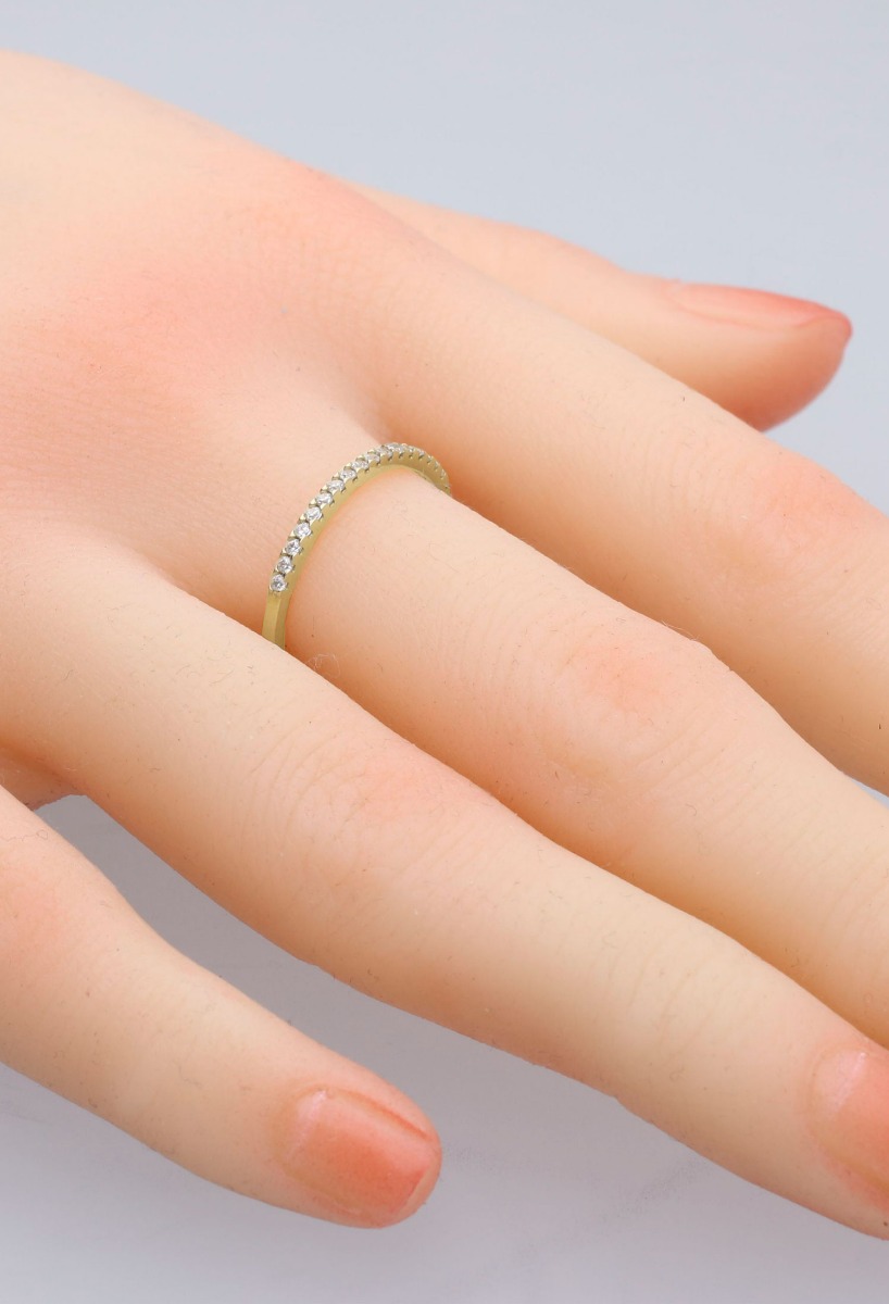 Anillo oro ley, medía alianza circonitas, este elegante anillo de oro amarillo de 18k con circonitas es la elección perfecta para cualquier mujer que busque un toque de lujo en su estilo. Con una media alianza de circonitas engastadas en garra, este anillo brilla con calidad y sofisticación. Con 1,5 milímetros de ancho, esta pieza es ideal para ser usada como ajustador y evitar que los anillos más grandes se salgan del dedo. Realizado en oro amarillo de primera ley 750 milésimas, este anillo es sin duda una adición refinada a cualquier colección de joyas.