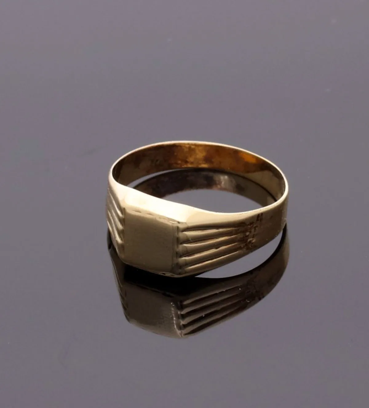 El diseño del anillo de oro combina una cabeza cuadrada lisa, perfecta para grabar, con un brazo decorado con gallones finamente definidos. Este estilo clásico lo convierte en una joya versátil, adecuada tanto para niños como para mujeres que buscan un sello elegante y discreto. Su estética es armónica, tradicional y al mismo tiempo moderna, pensada para perdurar generación tras generación.
