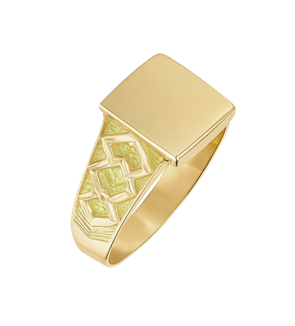 La característica más destacada es su superficie matizada en la cabeza, diseñada para que la inicial grabada resalte con brillo. Esta mezcla de acabado mate y brillo crea un contraste atractivo que convierte la pieza en algo único. Además, su estructura maciza garantiza que soportará sin problemas el paso de los años, conservando su belleza intacta. Es un anillo de oro pensado para durar toda una vida.
