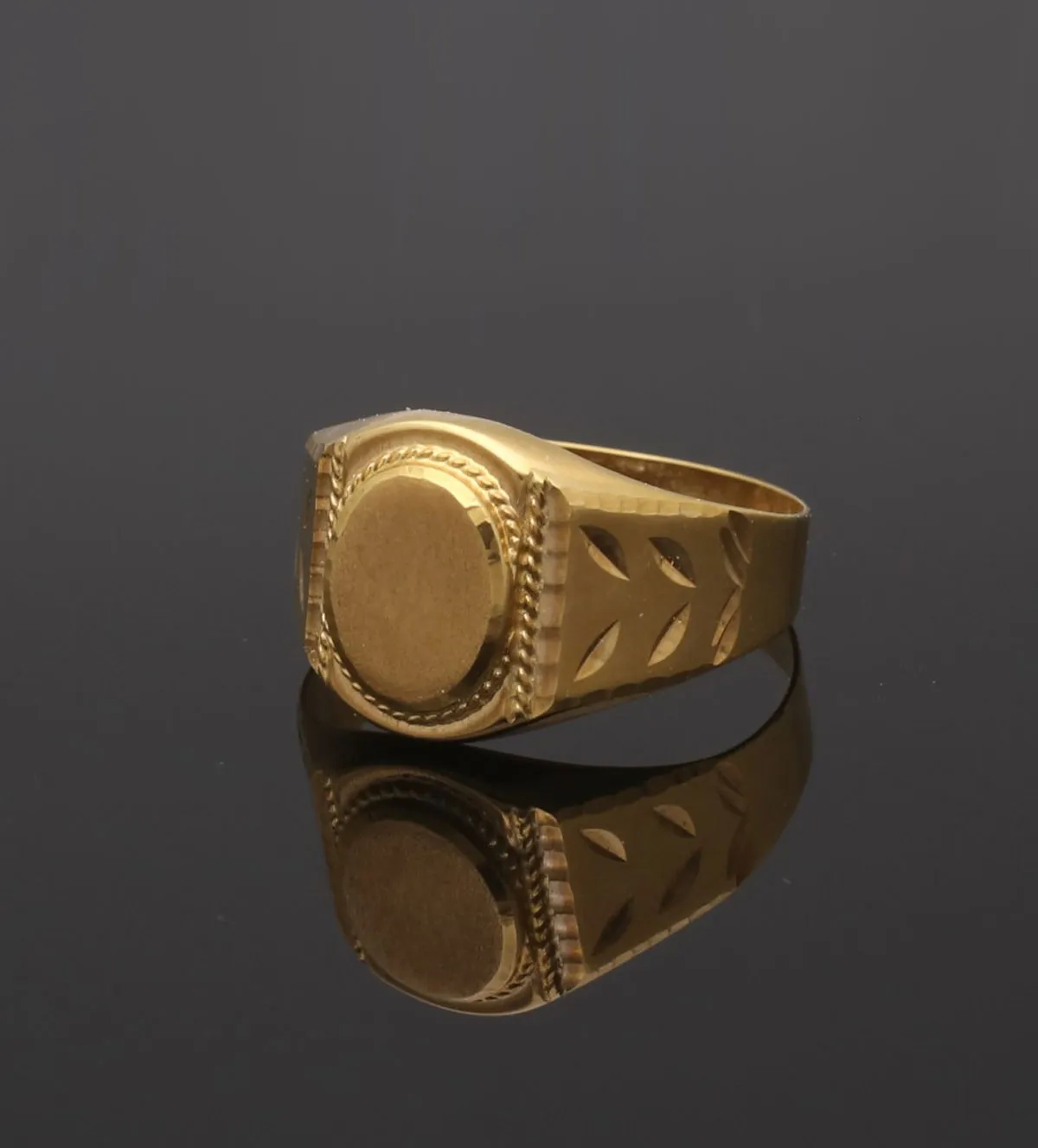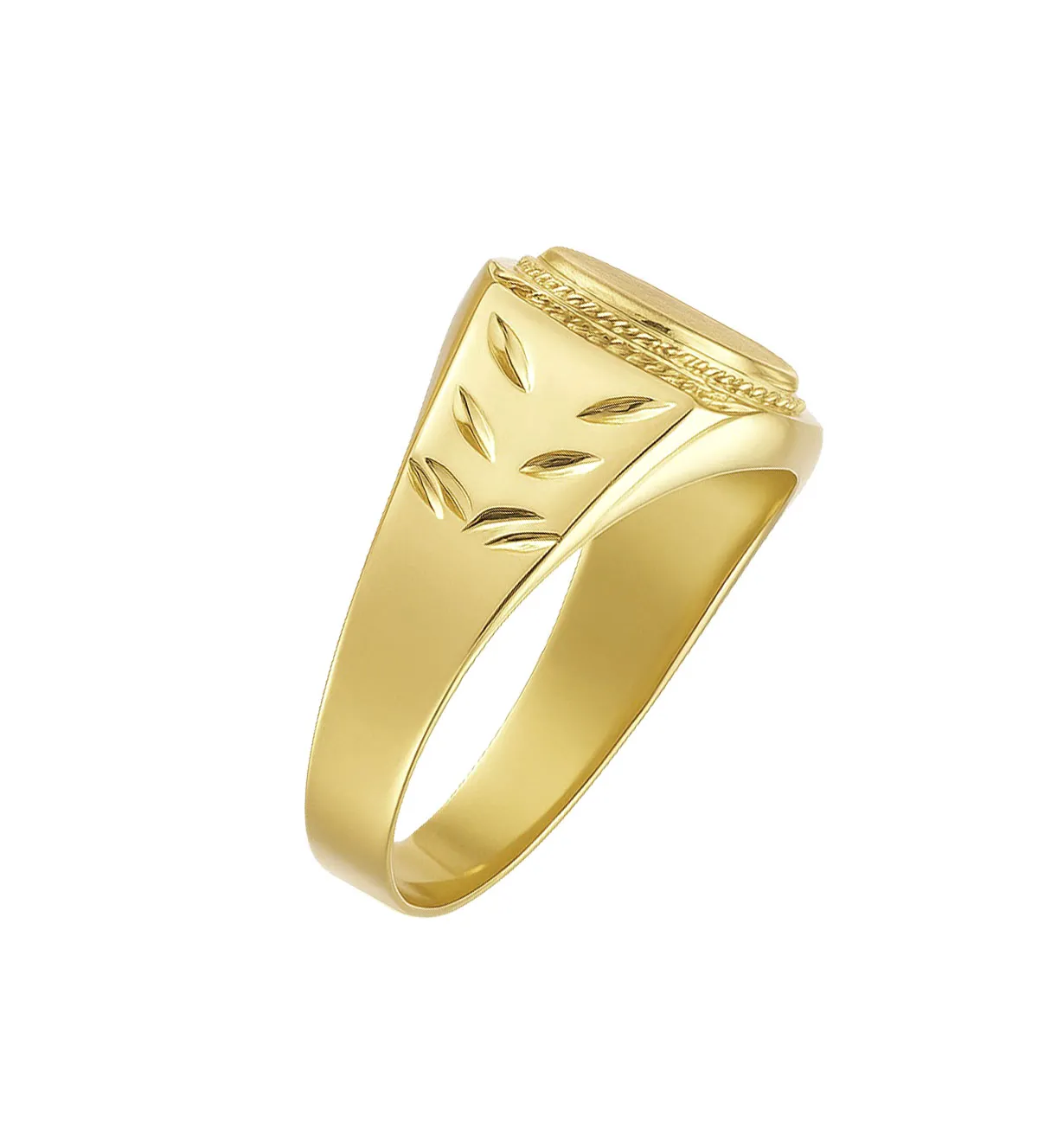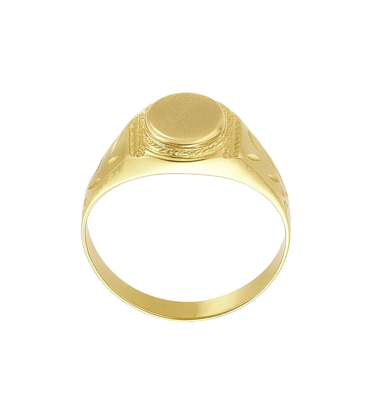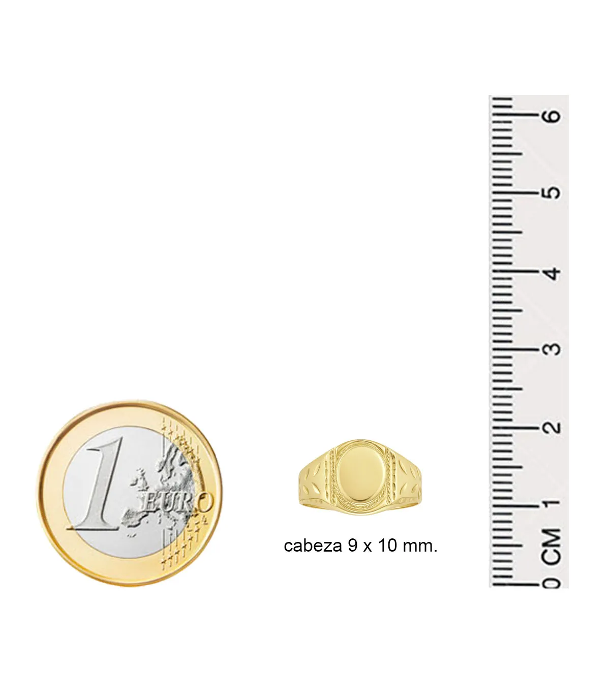 Este modelo destaca por su sello ovalado, finamente pulido y pensado para grabar iniciales de manera gratuita. La cabeza del anillo mide 12 x 9 mm y está acompañada por un brazo adornado con detalles lapidados que aportan textura y carácter. El resultado es un anillo de oro con una estética clásica que no pierde un toque juvenil, ideal para Primera Comunión. La composición visual mezcla suavidad en las líneas con un aire distinguido que lo hace especial frente a otros modelos.
