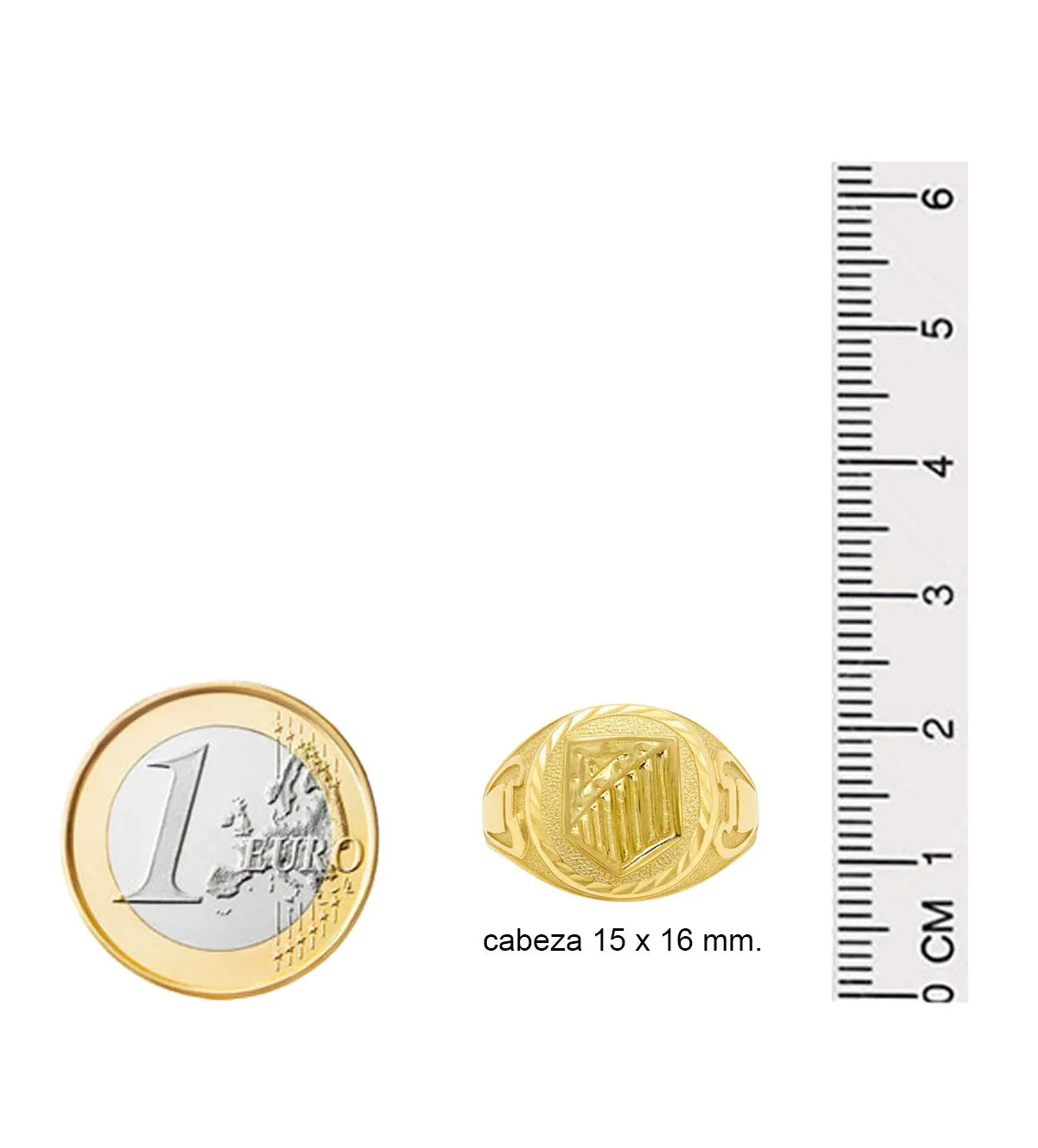 El diseño destaca por su cabeza ovalada de 15 x 16 mm, donde se presenta el escudo del Atlético de Madrid en bajorrelieve. Este detalle le da profundidad, textura y un acabado profesional que refleja fielmente el emblema del club. El anillo combina elegancia clásica con un toque deportivo distintivo, pensado para quienes desean una pieza discreta pero con un significado poderoso. El uso equilibrado del oro en su estructura ofrece un diseño estético y proporcional, ideal para manos de cualquier tamaño.