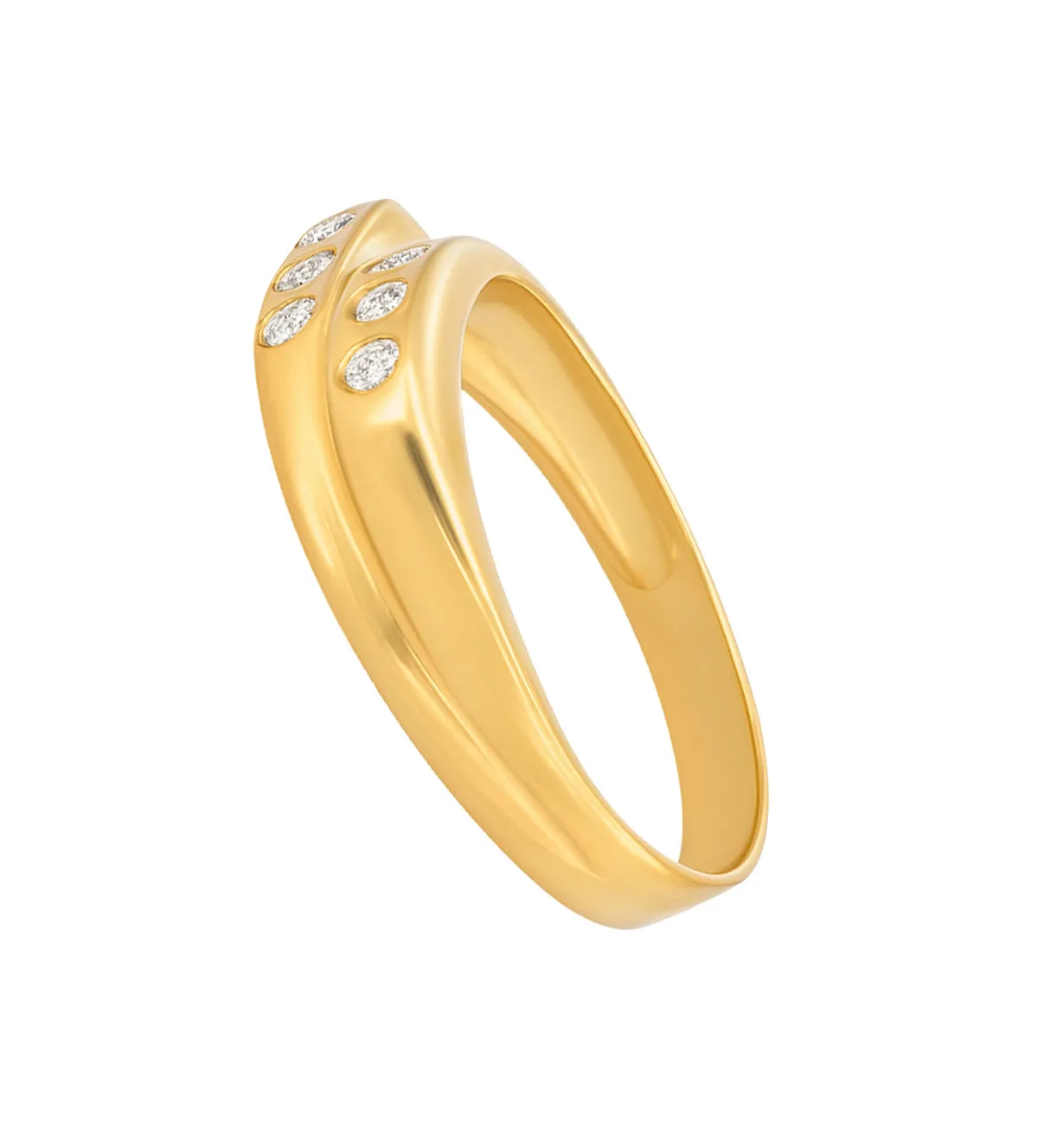 El diseño de este anillo de oro es su mayor atractivo. Dos anillos idénticos, unidos y contrapeados, crean una estructura original que simboliza equilibrio y dualidad. Su acabado pulido y la disposición de las circonitas logran un efecto de luz espectacular desde cualquier ángulo.