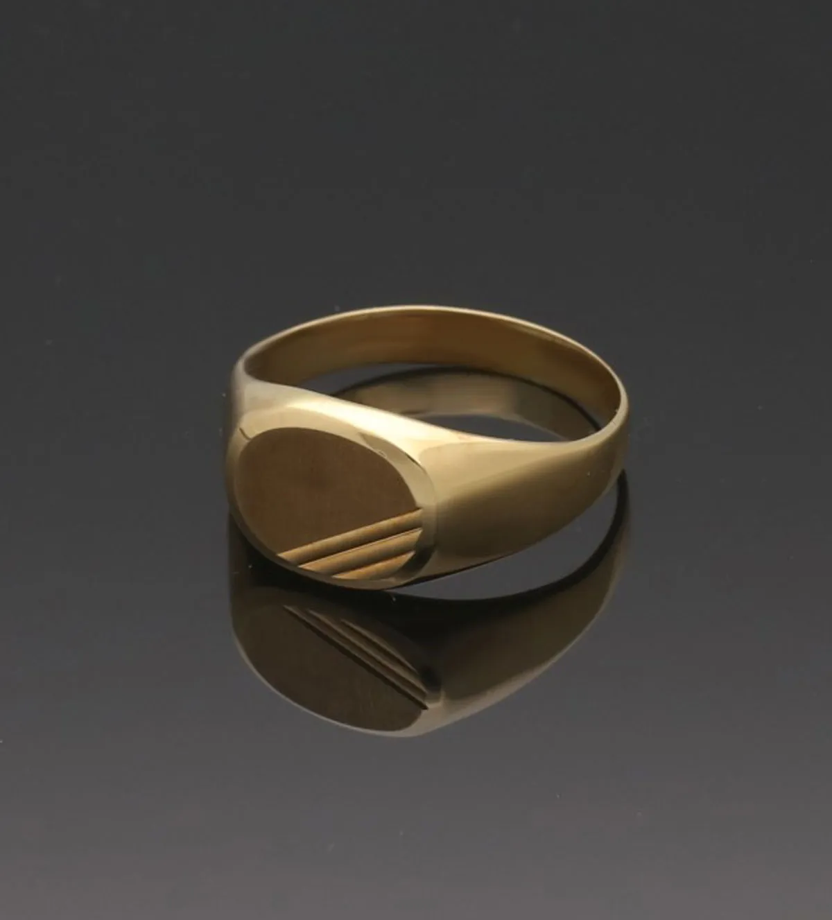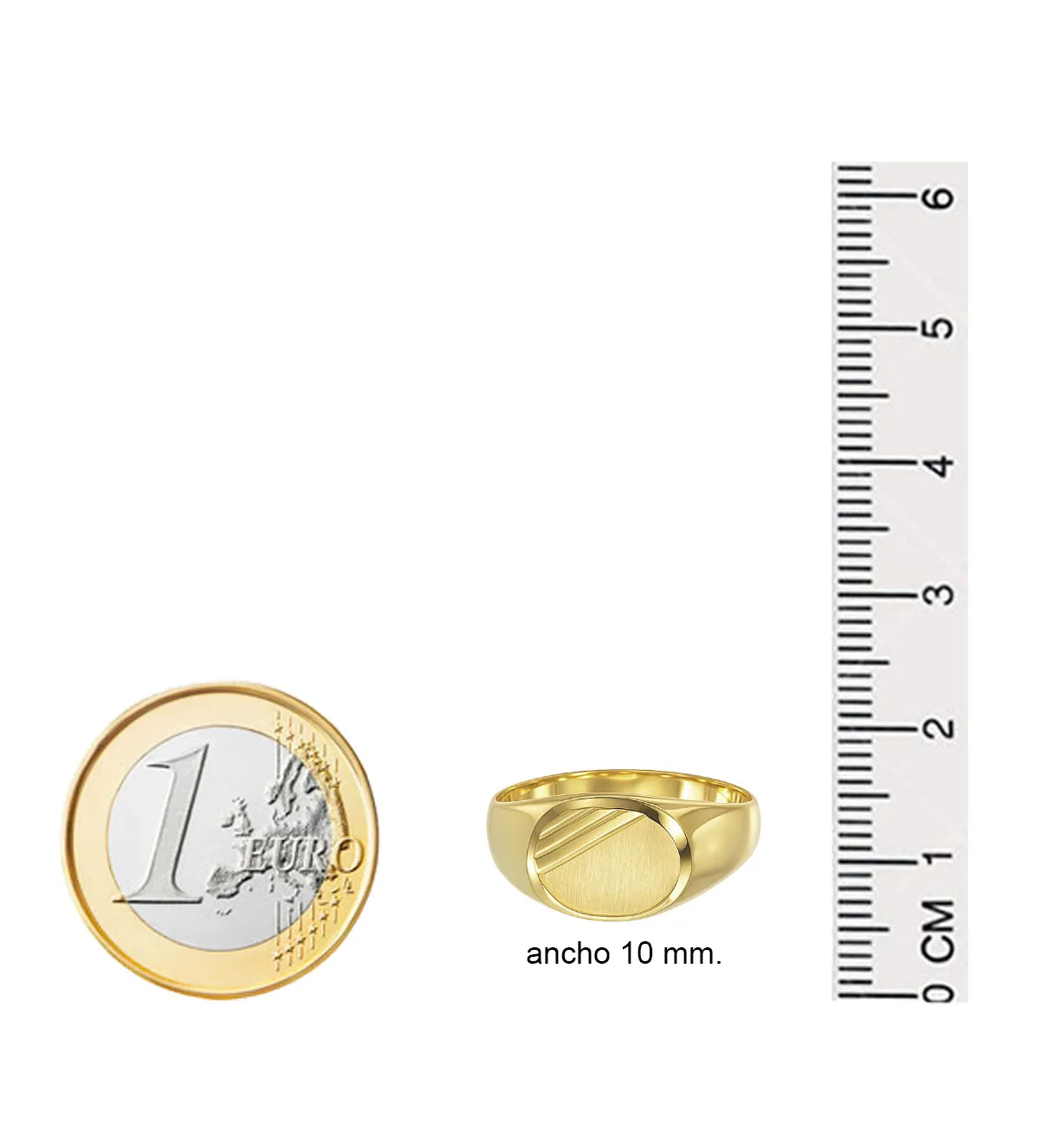 Anillo de oro para niño de Primera Comunión, elaborado en oro amarillo de 18 quilates con elegante cabeza ovalada y finas diagonales lapidadas. Un diseño clásico y distinguido, ideal para grabar iniciales y conservar como recuerdo eterno. Regala un símbolo de fe y estilo con acabado impecable y brillo duradero. Disponible ahora en Rubí Joyeros, ¡aprovecha el precio especial antes de que se agote el stock!
