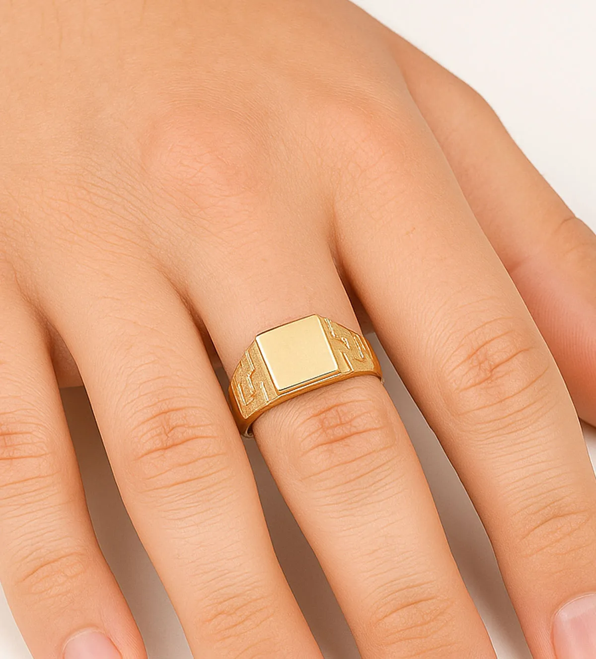 Su diseño macizo con cabeza cuadrada aporta firmeza, presencia y un estilo sobrio que encaja perfectamente en un anillo pensado para niño. La superficie de la cabeza es ideal para grabar iniciales, convirtiéndolo en un recuerdo totalmente personal. El brazo adornado con grabados en relieve que contrastan sobre un fondo mate añade profundidad y luz al diseño, creando un juego visual elegante y refinado. Este anillo de oro ha sido creado para destacar sin exageración, manteniendo esa estética clásica que nunca pasa de moda.