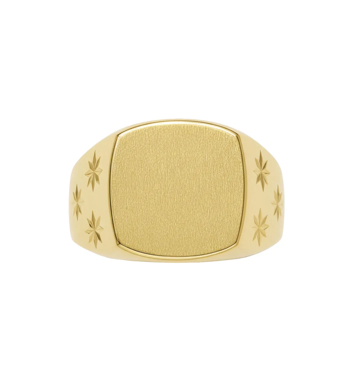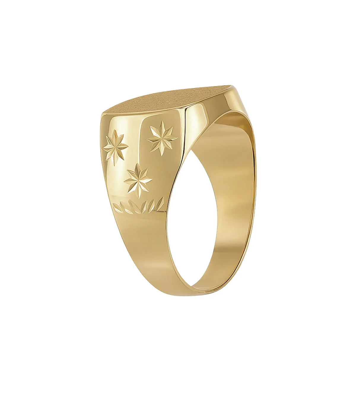 Este sello masculino destaca por su brazo ancho con detalles lapidados que forman motivos estrellados. Su silueta imponente apuesta por un diseño geométrico equilibrado y visualmente potente.