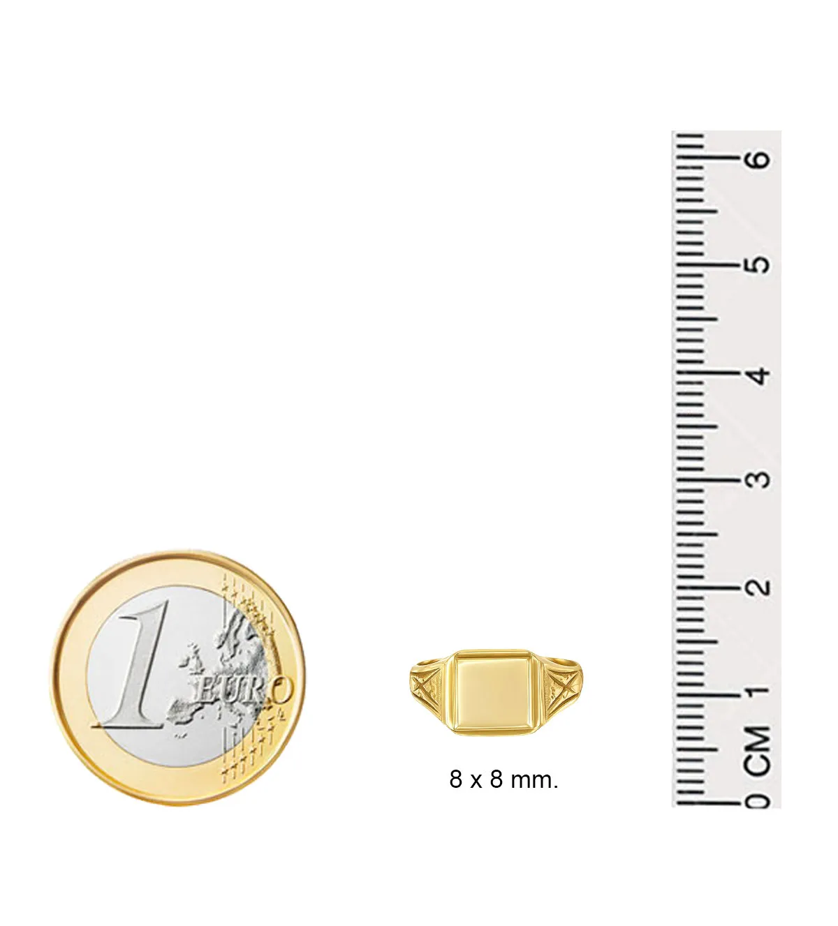 El diseño del anillo combina tradición y refinamiento. Presenta una cabeza cuadrada de 8×8 mm, perfectamente pulida, pensada para realizar grabados personalizados de iniciales u otros símbolos.