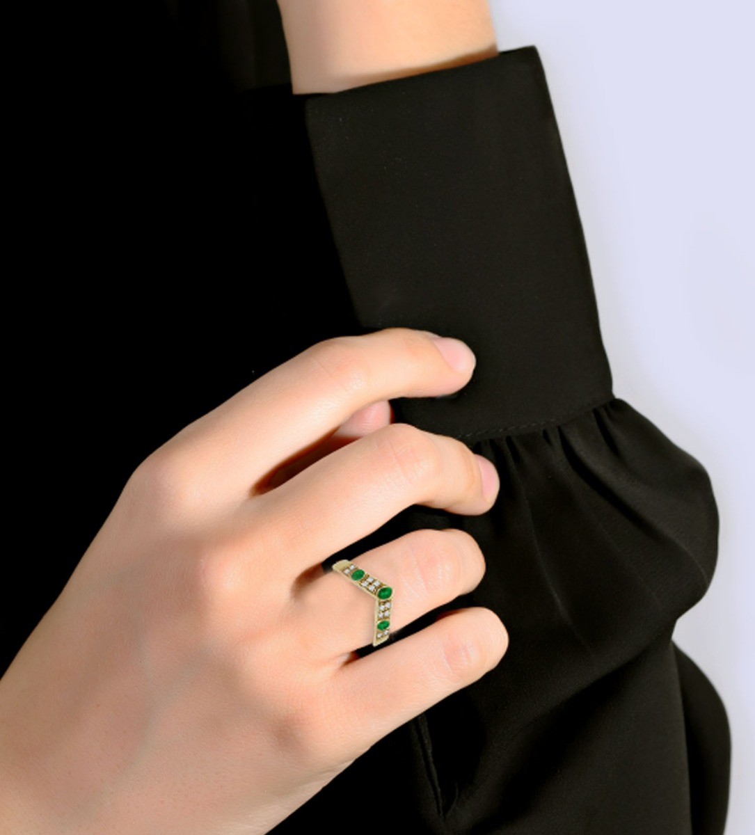 Diseñado a la perfección, el diseño de punta plana muestra tres impresionantes esmeraldas colocadas a igual distancia, cada una brillando con su encanto único. Alrededor de estas piedras preciosas hay grupos de diamantes de talla brillante, que añaden un brillo encantador que capta la luz sin esfuerzo.