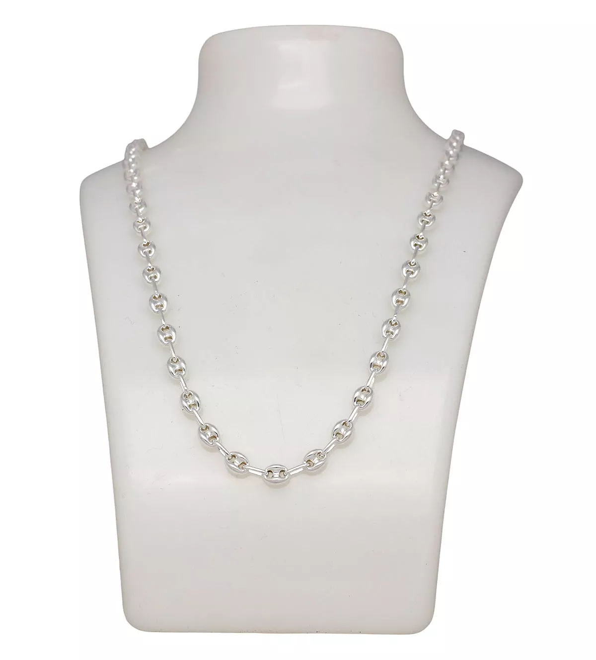 Con eslabones macizos de 8×10 mm y un acabado pulido, esta cadena equilibra ligereza y presencia. Cada detalle de su diseño ha sido pensado para ofrecer una pieza que resalte por sí misma o complementada con colgantes grandes. El cierre de mosquetón, además de seguro, añade un toque práctico y moderno. Es una joya que combina la tradición de la platería artesanal con un diseño contemporáneo, ideal para cualquier estilo.
