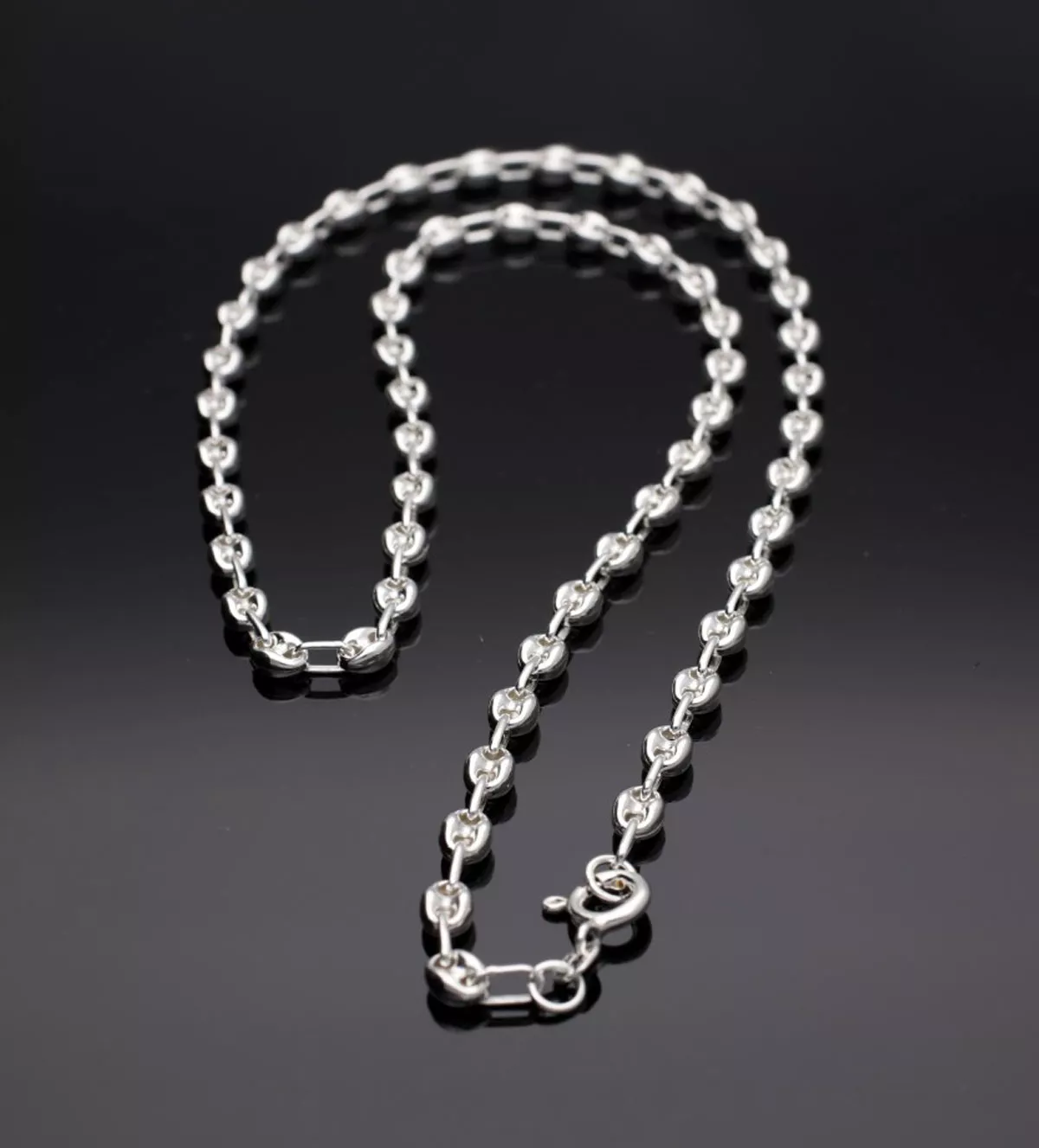 Lo que realmente distingue a esta cadena de plata es su combinación de elegancia y funcionalidad. El diseño semihueco permite disfrutar de una pieza llamativa sin añadir peso innecesario, mientras que el cierre de mosquetón asegura que siempre esté firmemente ajustada. Además, al ser un producto en stock de entrega inmediata, podrás disfrutar de tu joya sin esperas.
