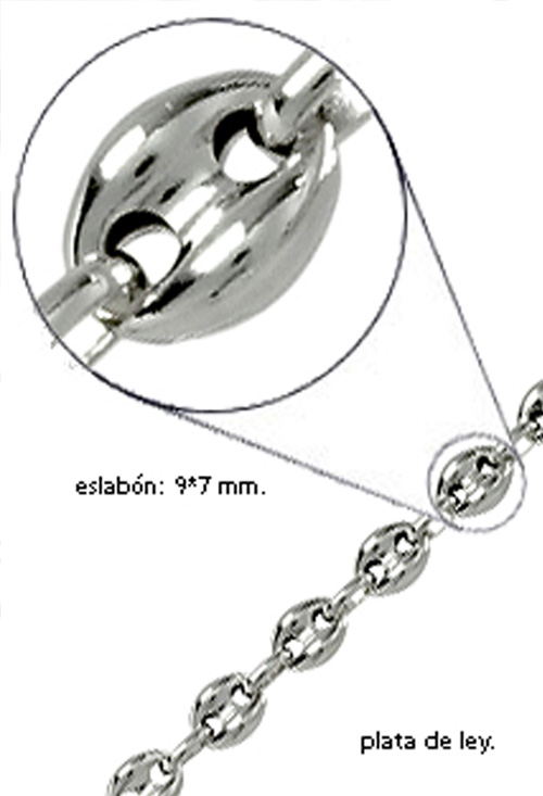 Cadena plata de ley (925 milésimas) eslabones semihuecos sólidos de gran resistencia modelo calabrote de 9×7 milímetros cada uno y un peso de 26 gramos aproximadamente, mide 60 centímetros de largo y dispone de un cómodo y seguro cierre de mosquetón, terminado baño de rodio, perfecto para llevar solo o con algún tipo de colgante grande.