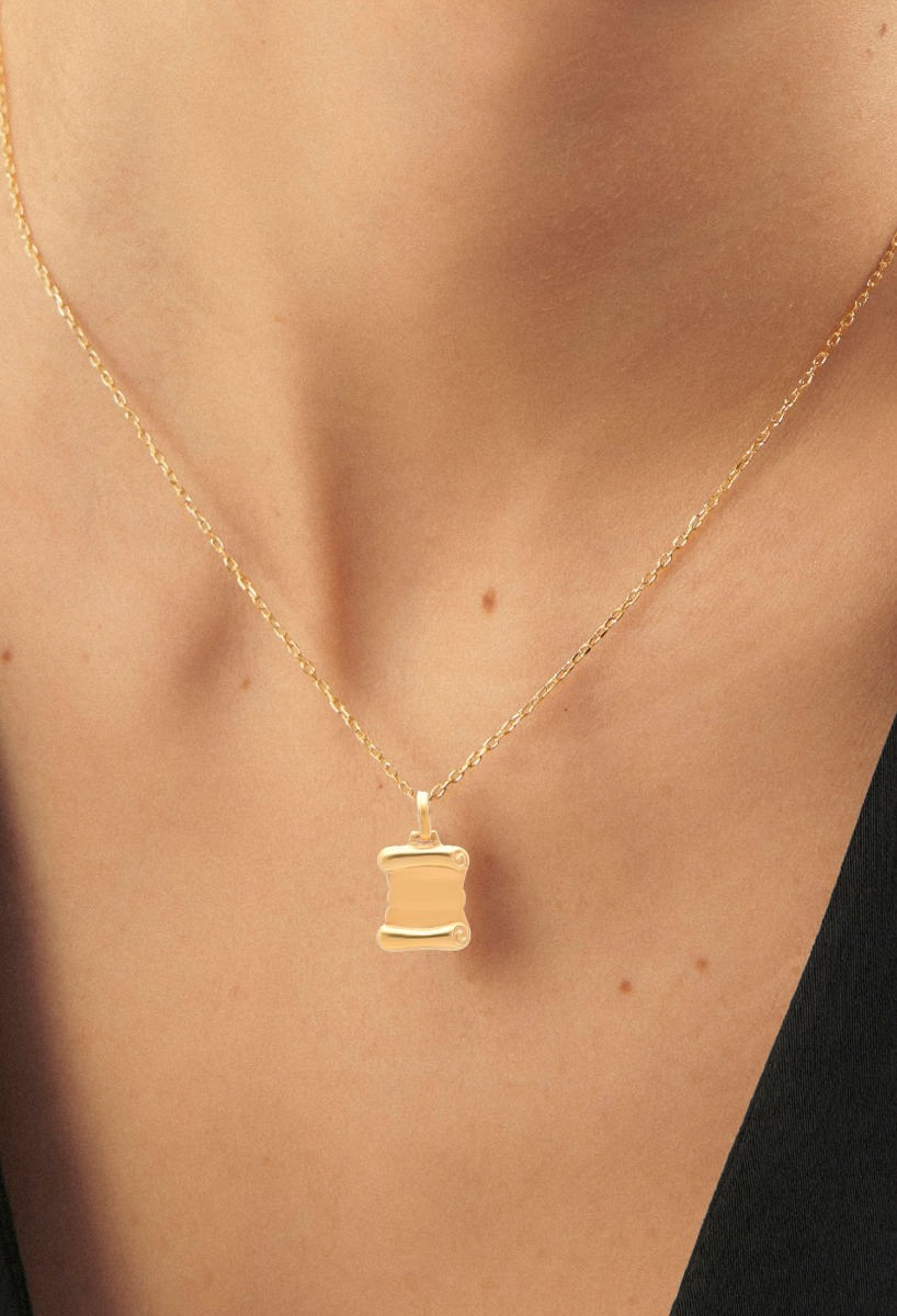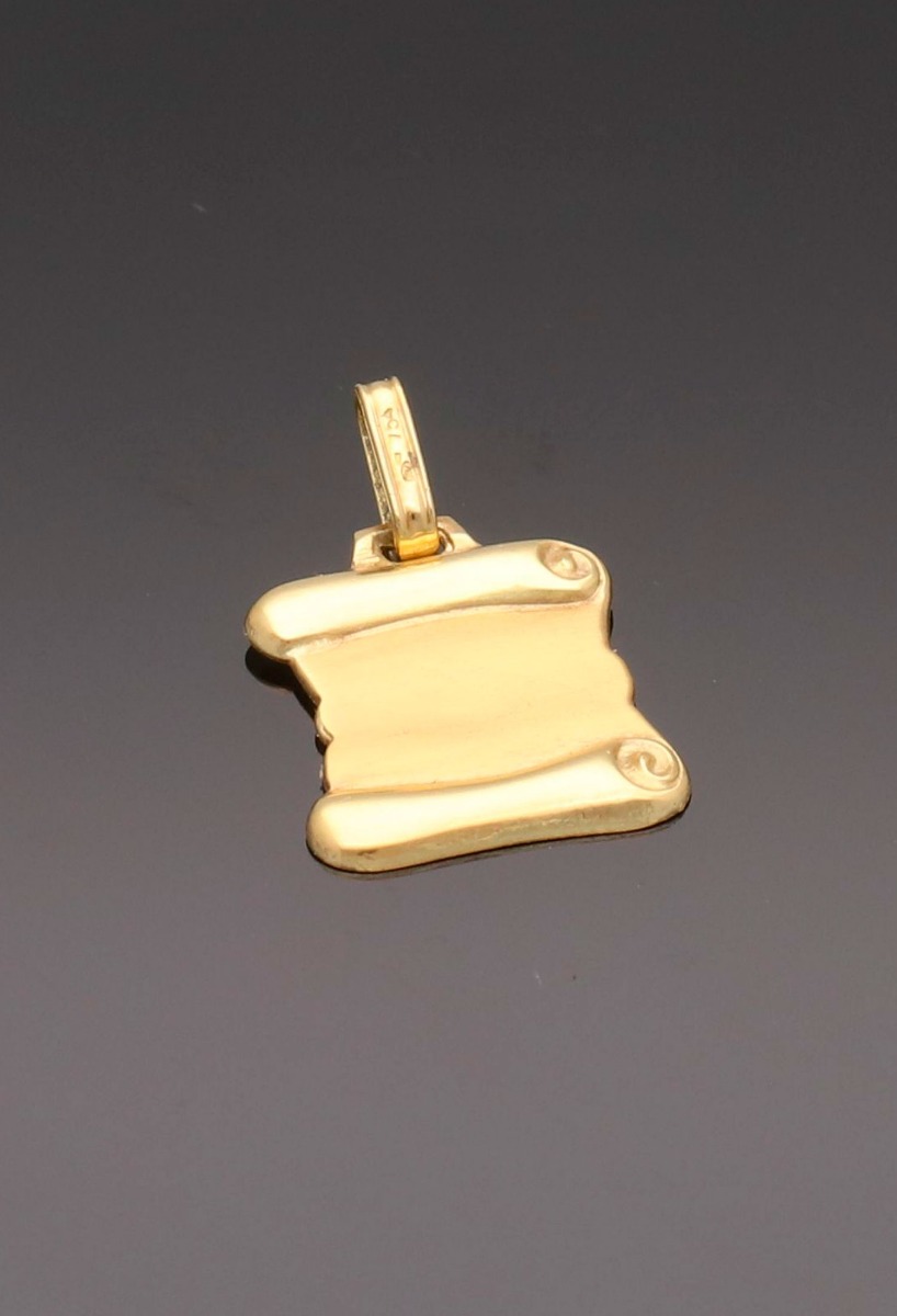 Chapas de oro amarillo de 18 kilates para grabar el nombre, la que aquí mostramos en forma de pergamino antiguo con terminación combinada mate y brillo, ideal para grabar una inicial o cualquier otro tipo de grabado. Chapa de identidad con forma de pergamino de oro amarillo de 1ª Ley para grabar el nombre de su portador o de quien se prefiera. Un regalo personal tanto para hombre como para mujer.
