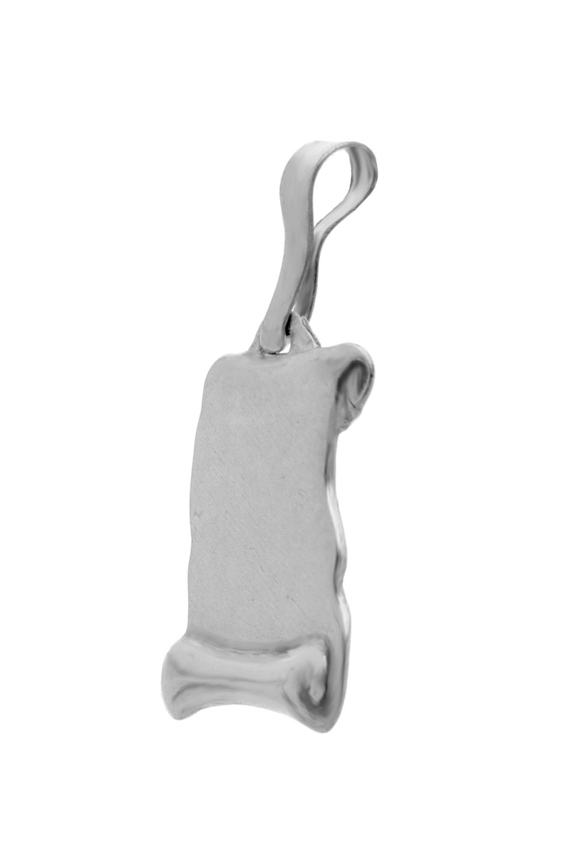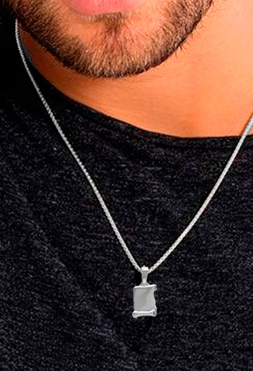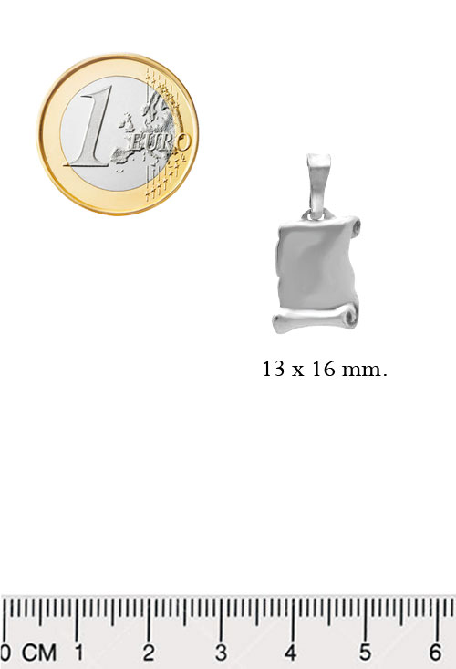 Chapa identidad plata tipo pergamino, típico modelo en forma de antiguo pergamino liso por ambas caras con terminacion en brillo pulido, un pequeño detalle donde poder grabar un mensaje o bien datos de identidad, es un colgante ideal para utilizar de forma habitual por hombres y mejeres de cualquier edad.
