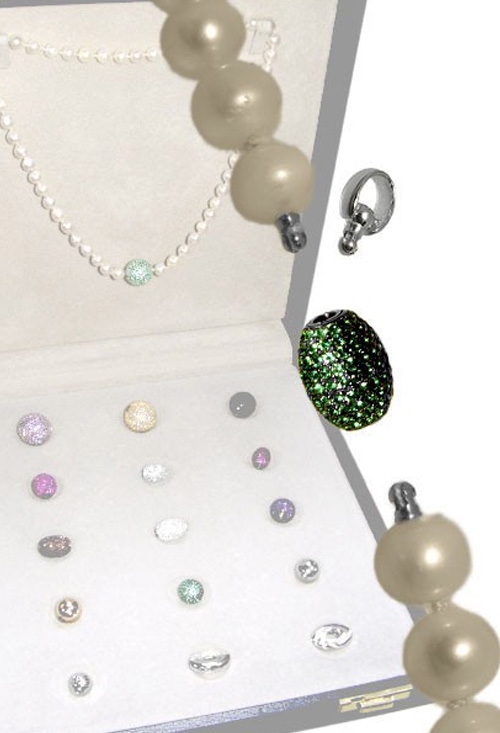 Este broche al que incorporándole un asa lo convertimos en colgante, nos sirve para collares de cuentas enfiladas (perlas, corales, malaquitas, etc.) a los que se les haya incorporado en el enfilado los terminales necesarios para poder ajustar este formato, que permite substituir uno por otro diferentes modelos de broches y poder lucir el mismo collar con un aspecto totalmente distinto cada día.