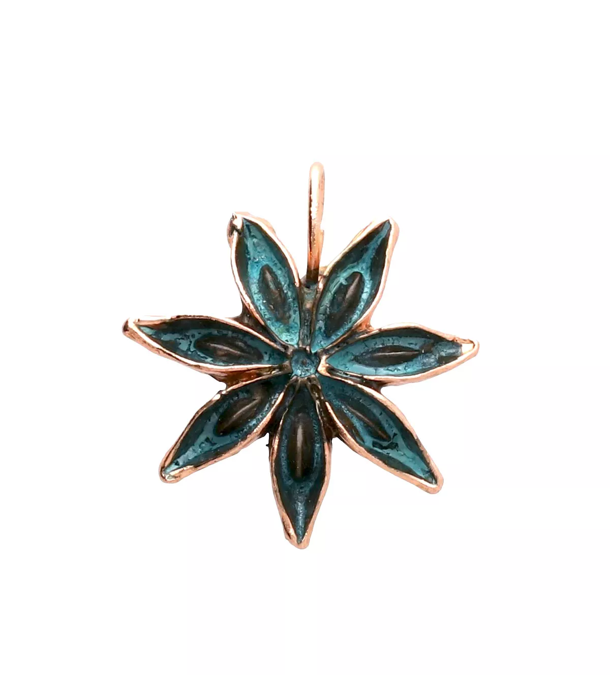 Este colgante tiene unas medidas de 22×22 mm, ofreciendo una presencia destacada y elegante. Cada pieza es única, recolectada cuidadosamente en el bosque y procesada artesanalmente para asegurar la más alta calidad y exclusividad. La flor de anís, con su diseño natural y detallado, es el centro de atención en este colgante, realzada por el acabado metalizado.