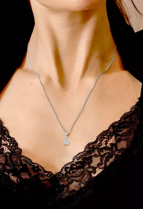 Colgante de oro blanco 18k roseta diamantes, si eres capaz de imaginarla luciendo en tu cuello no podrás resistirte a adquirirla, una joya para toda la vida con un cuajo en roseta de 10 brillantes que consiguen gracias a su engastado artesanal dar la apariencia solo uno de gran tamaño, brillos por doquier deslumbraras cada vez que te lo pongas.