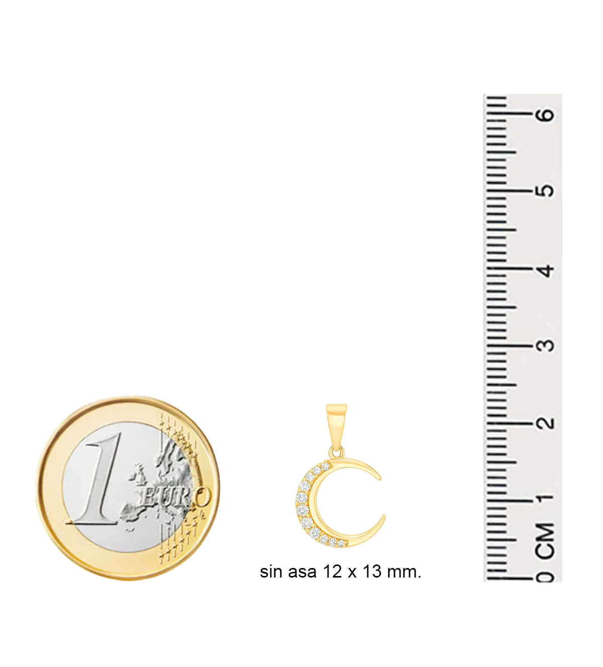 Su silueta de luna creciente evoca magia, feminidad y renovación. El asa en forma de escudo aporta un detalle distintivo y elegante, pensado para realzar la caída del colgante en cualquier cadena. El acabado de brillo pulido intensifica la luminosidad del oro y la pureza de los circones, creando un contraste visual fascinante.