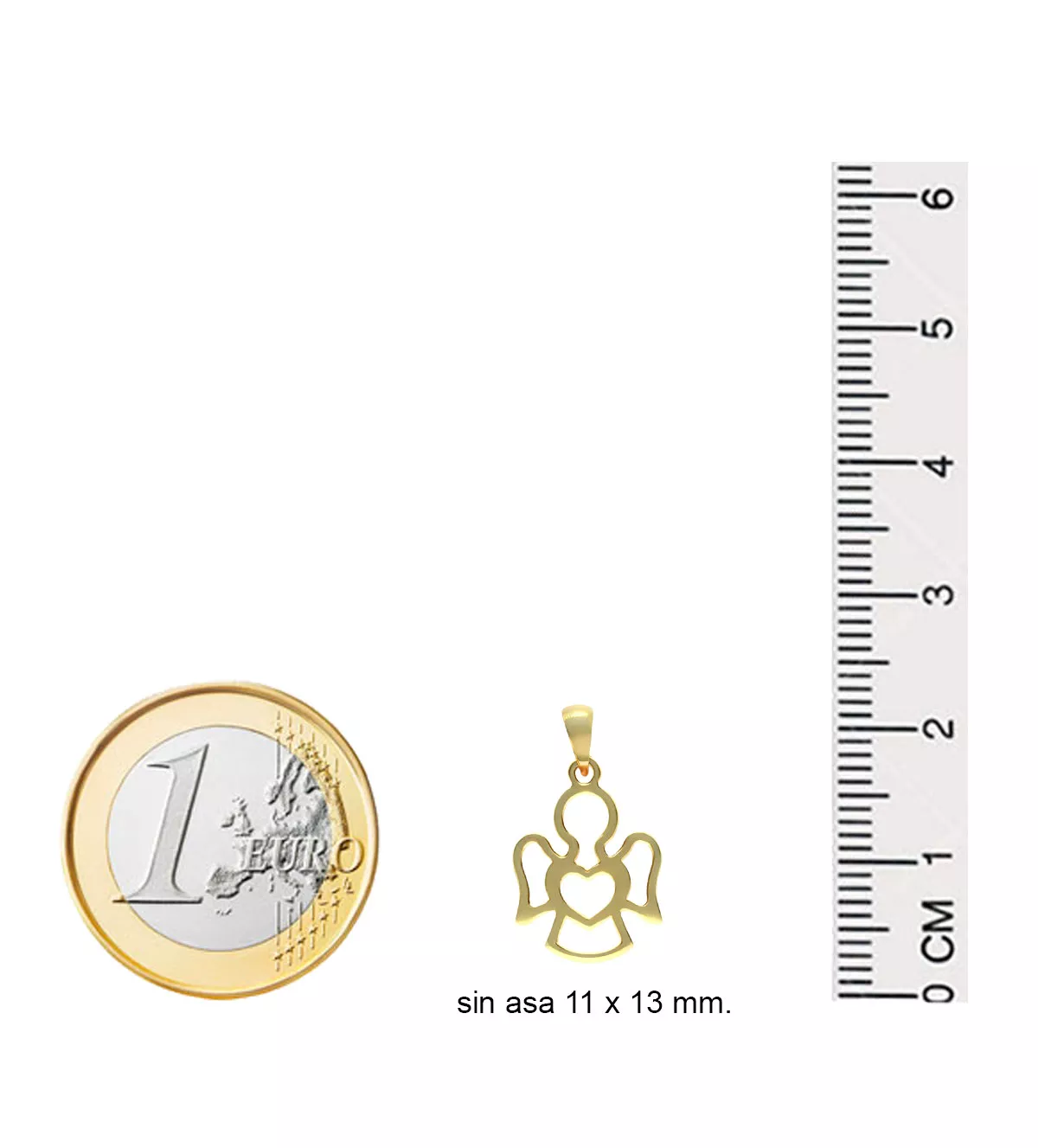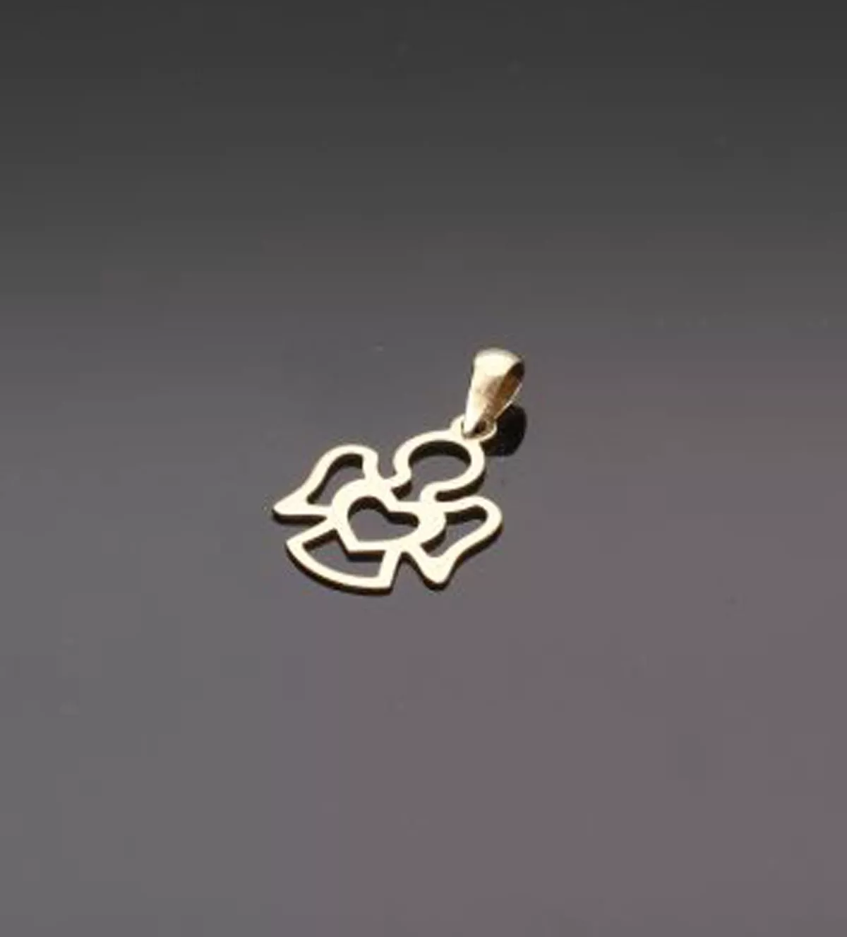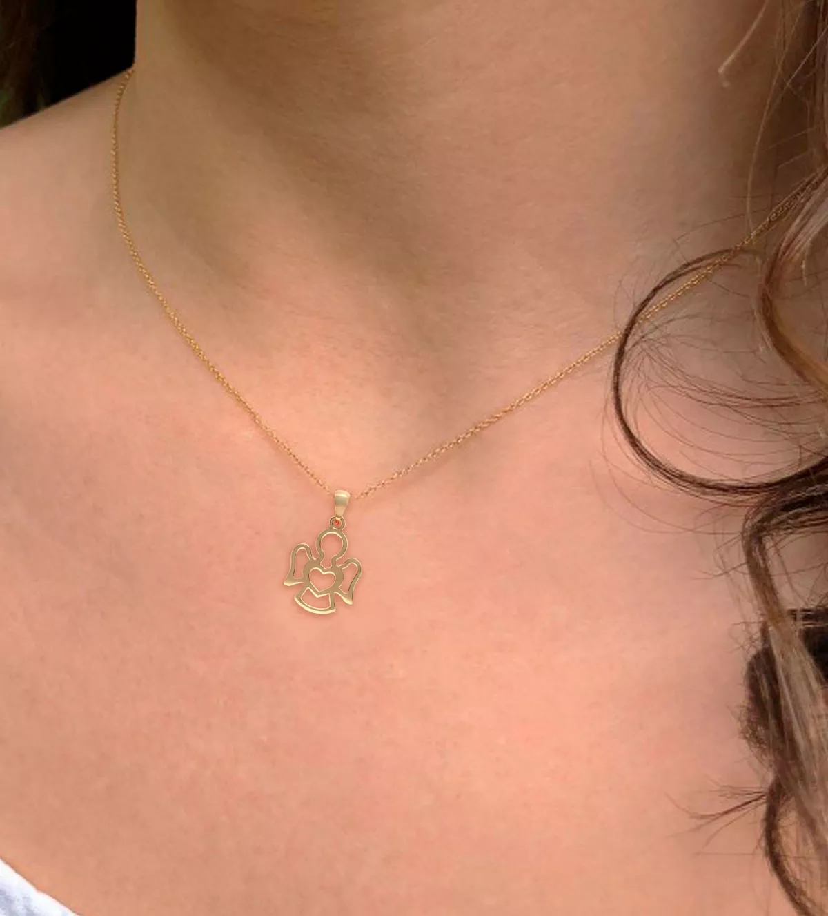 La estructura del colgante es ligera y cómoda, lo que permite llevarlo puesto todo el día sin que resulte molesto. Además, el acabado pulido del oro amarillo resalta los detalles del diseño, haciendo que las alas del ángel y el corazón calado brillen con un destello cálido y acogedor.