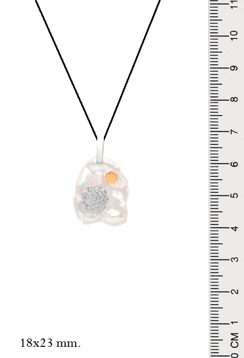 Colgante oro 18 kilates nácar y circonitas, exclusivo diseño que conjunta la belleza del nácar con la pasión del oro y el brillo del cristal, un escogido trozo de nácar sirve de base a una roseta de oro blanco cuajada de circonitas y una forma de flor oro amarillo, se cuelga de cualquier tipo de cadena utilizando un asa plana de oro blanco.