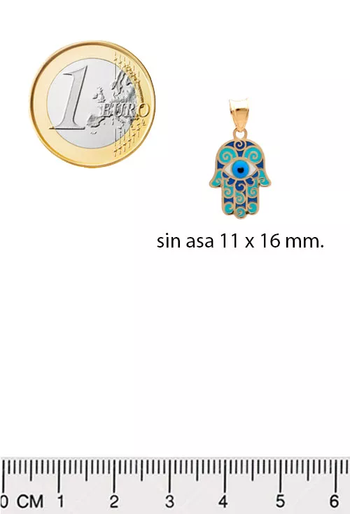 Colgante oro 18 ktes Mano de Fátima. exclusivo modelo de este signo universal que aúna en un colgante el Hansa y el Ojo de la suerte, aunando la belleza del oro con la del multicolor esmalte, realiza tu mejor compra aprovechando nuestro descuento.