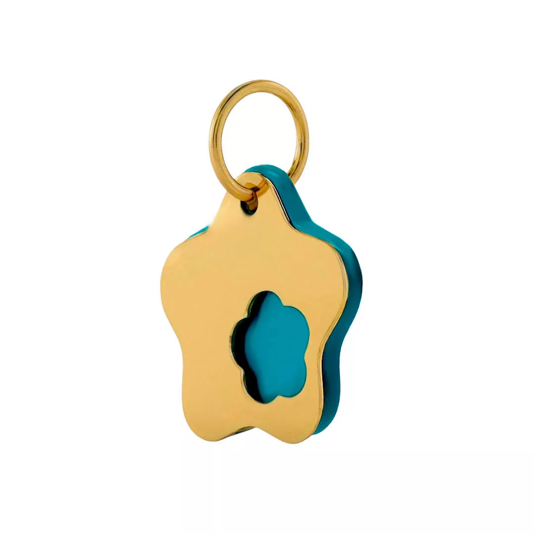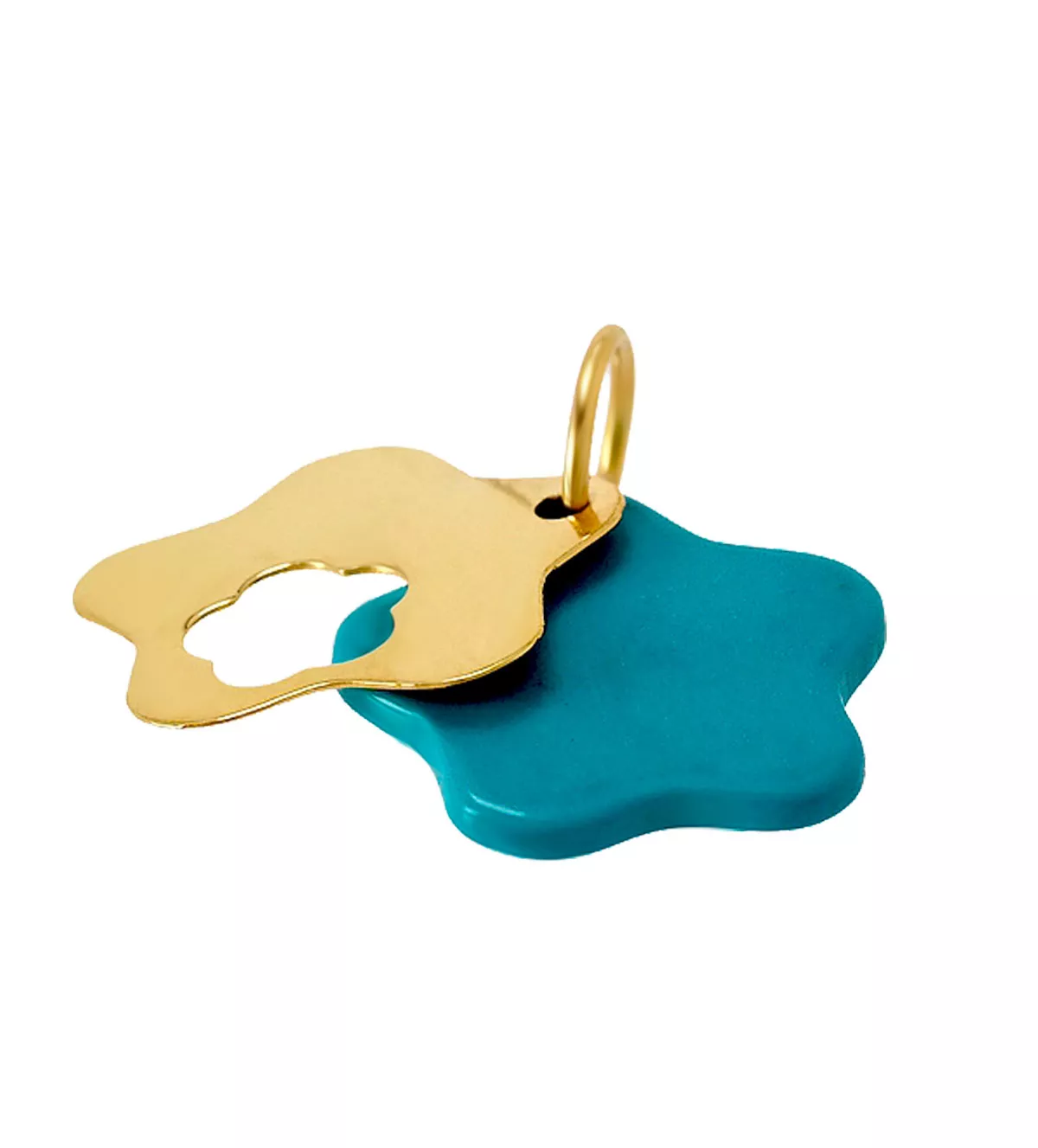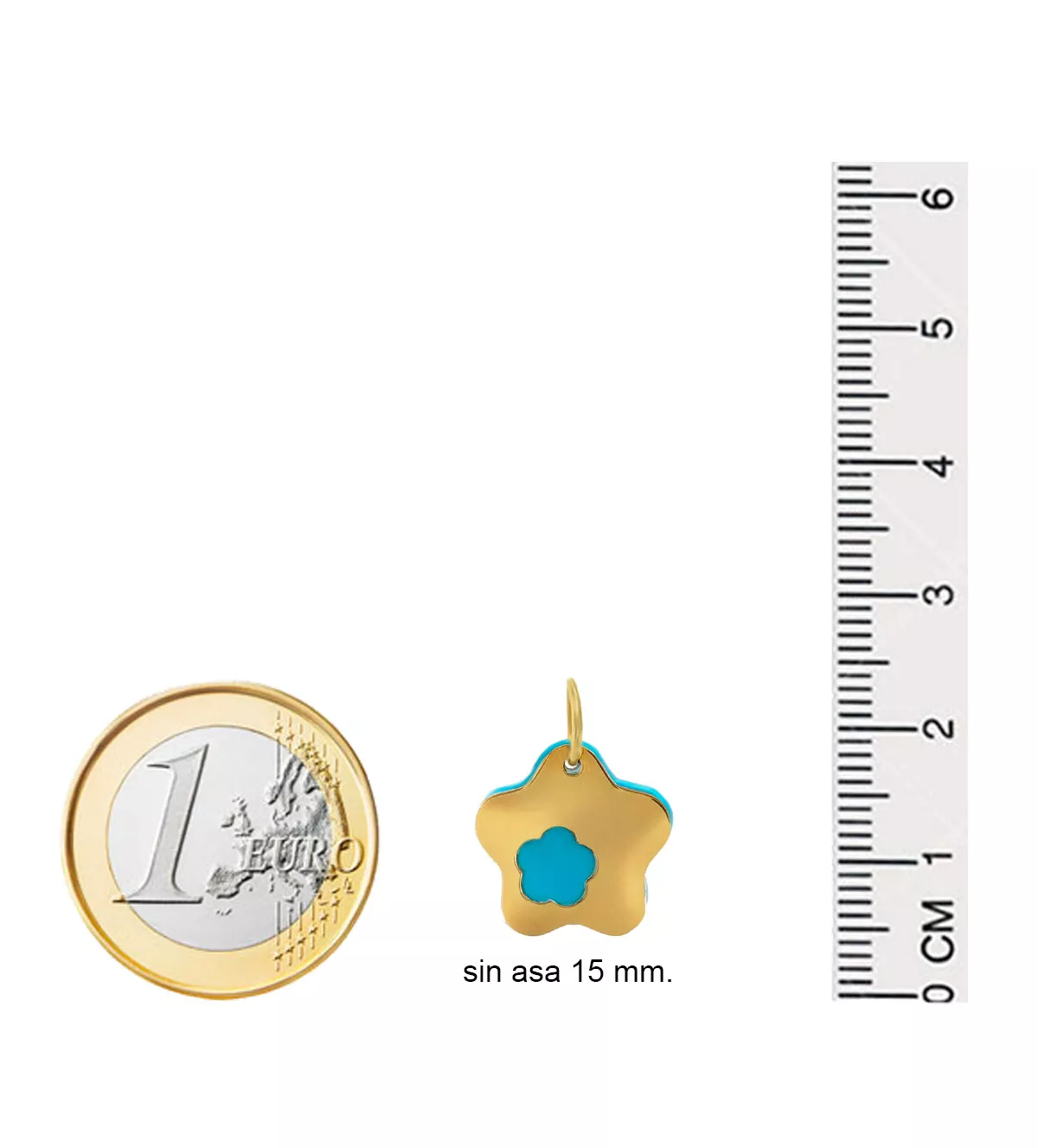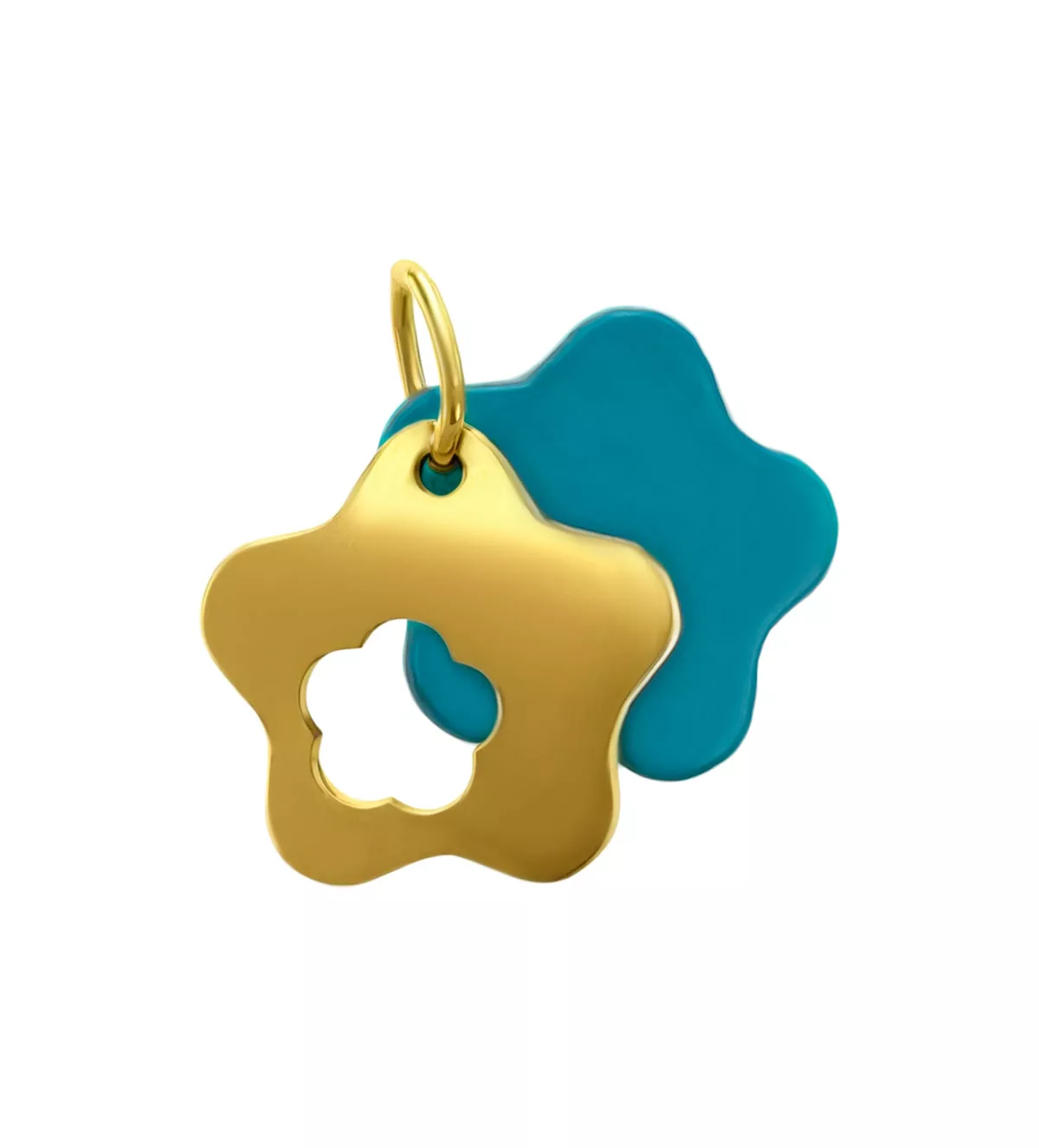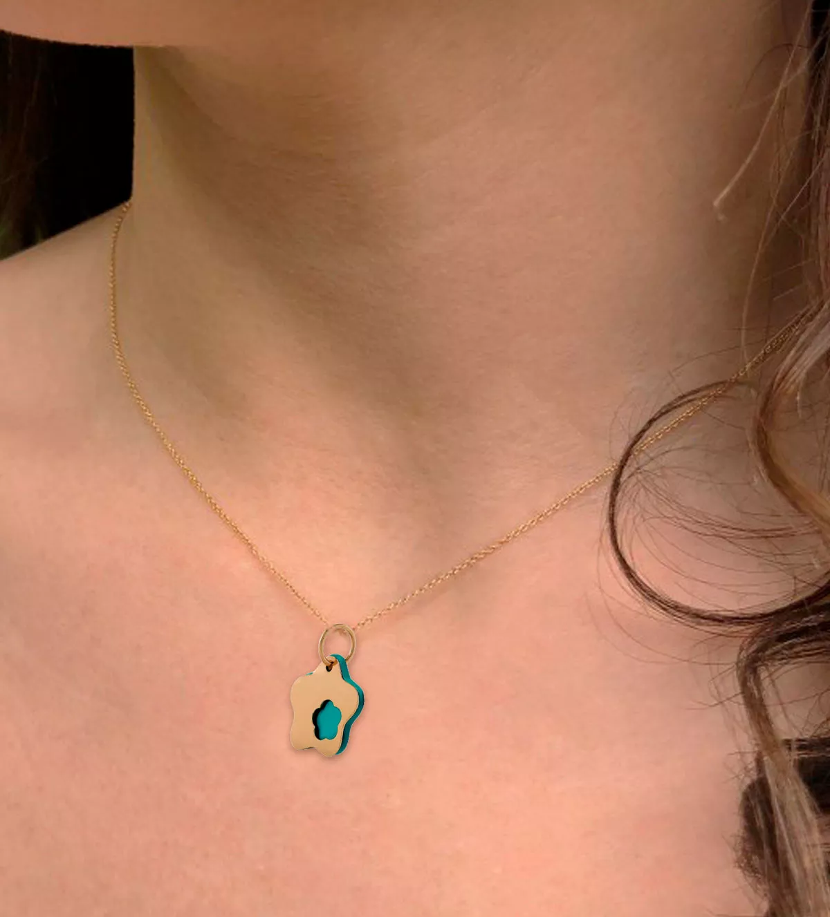 El diseño del colgante es una delicada representación de una flor de cinco pétalos. La flor de oro amarillo calada se superpone sobre la base de turquesa, creando un efecto tridimensional único. Ambas piezas están unidas por un asa que permite un movimiento articulado, añadiendo dinamismo y originalidad a la joya. Este diseño no solo es visualmente atractivo, sino también práctico y cómodo de llevar.