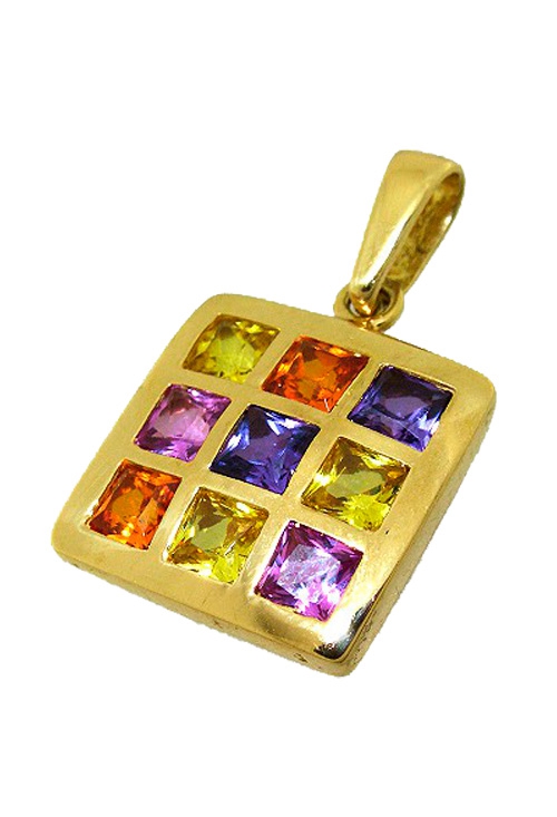 Colgante oro amarillo 18 kilates de forma cuadrada formando en su interior un damero con piedras de talla cuadrada engastadas a ras, combina diferentes tipos de piedras formando un frontis multicolor, rosa de francia, amatista olivina y citrinos forman un resultado original lleno de gamas, tiene un asa de escudo para poder colgarlo de cualquier tipo de cadena, es un diseño muy original que queda precioso a modo de gargantilla y que puedes conjuntar con pendientes y sortija, mide 17×17 milímetros y pesa 5,40 gramos.