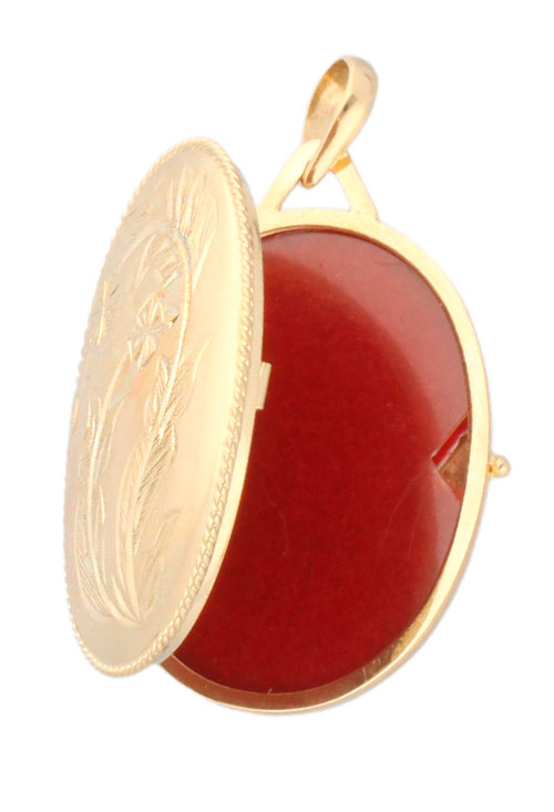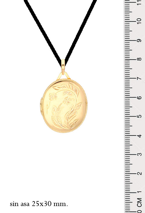 Colgante relicario oro amarillo 18 kilates tambien llamado guardapelos o portafotos tapa frontal grabada a mano con motivo floral y parte posterior lisa donde poder grabar por ejemplo un enlace de iniciales, dispone de fondos en ambas tapas, el regalo perfecto para dejar un recuerdo imborrable con el paso del tiempo, guardar un sentimiento que nos acompañe el resto de nuestra vida.