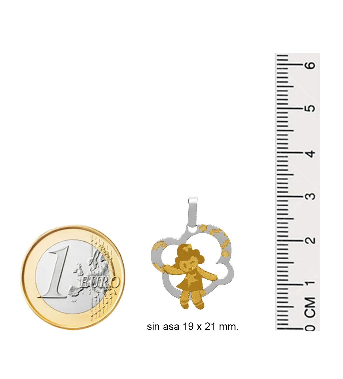 Este colgante está elaborado en oro bicolor de 18 quilates, un material noble y duradero que garantiza calidad y resistencia a lo largo del tiempo. La combinación de tonos en acabado mate y brillo resalta los detalles de la figura, aportando luz y contraste a la composición. Su fabricación con tecnología láser asegura precisión y una definición impecable.
