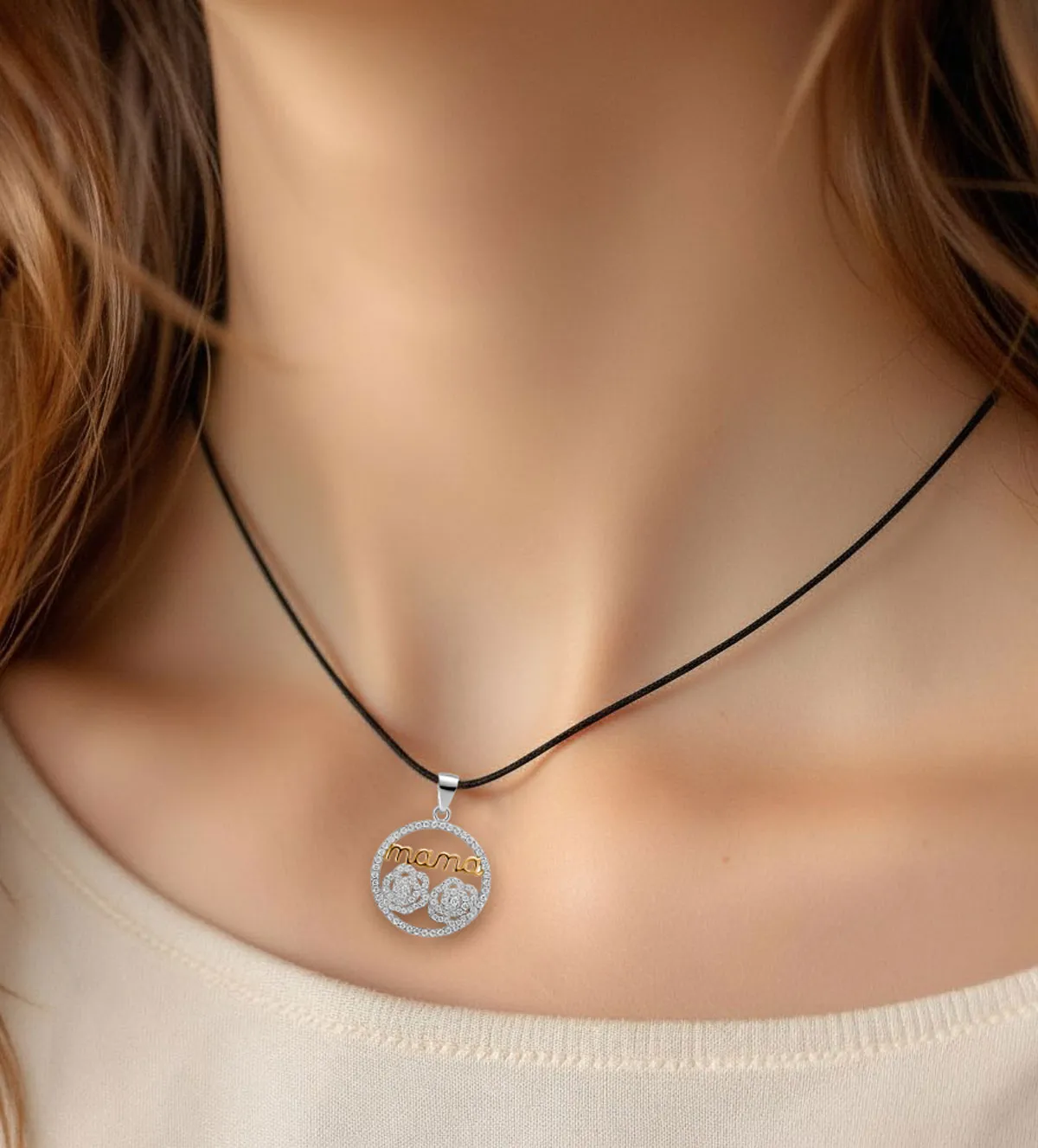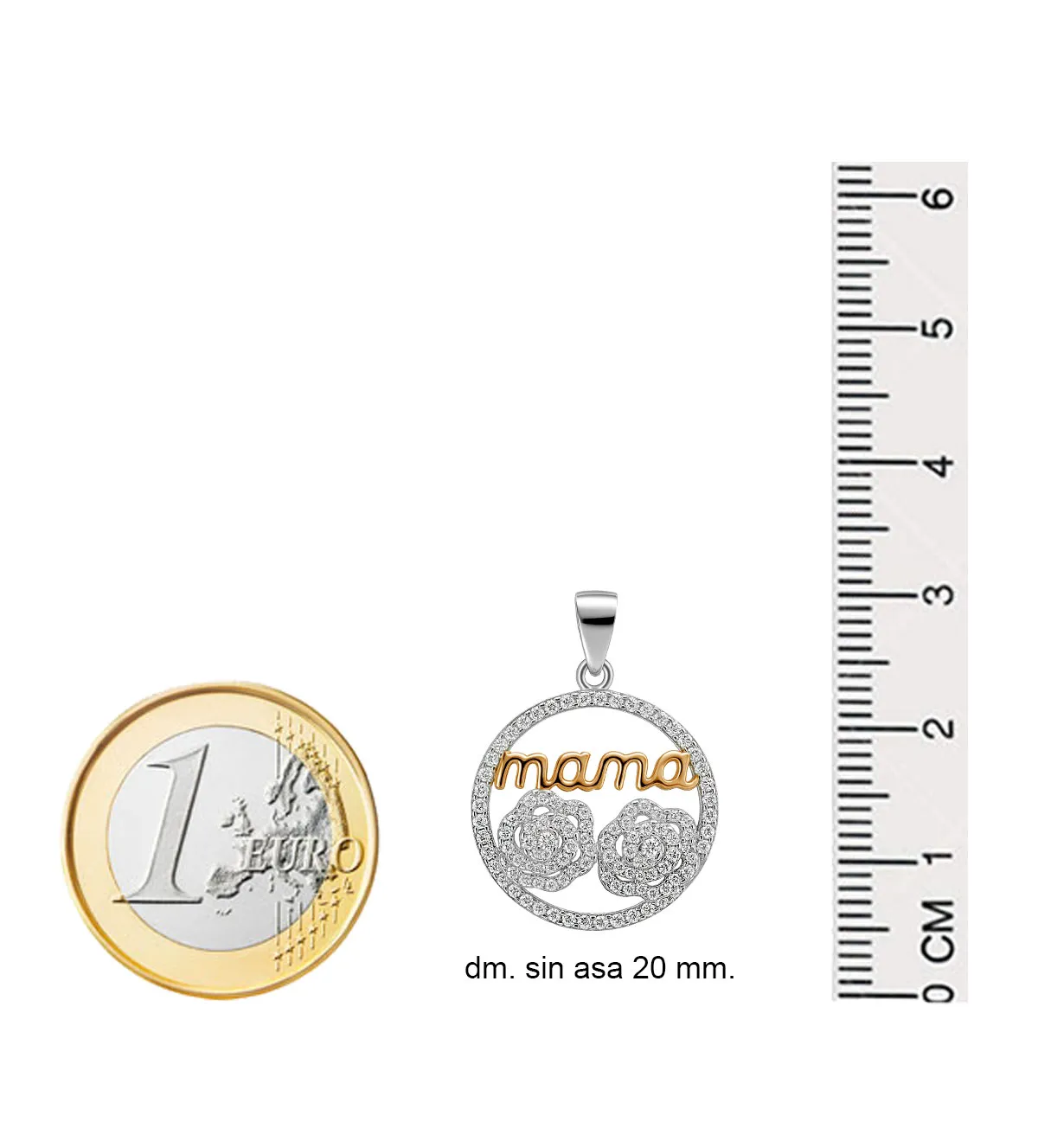 Cada detalle del colgante de plata ha sido cuidadosamente trabajado para lograr una pieza emotiva y especial. Su estructura circular está rodeada por una orla de circonitas transparentes que aportan luminosidad. En el interior, un calado perfectamente definido revela dos formas florales, junto al texto “mamá”, ambas bañadas en oro rosa. Este contraste entre la plata brillante, el oro rosa y las circonitas convierte el colgante en una joya de estética delicada y muy femenina.