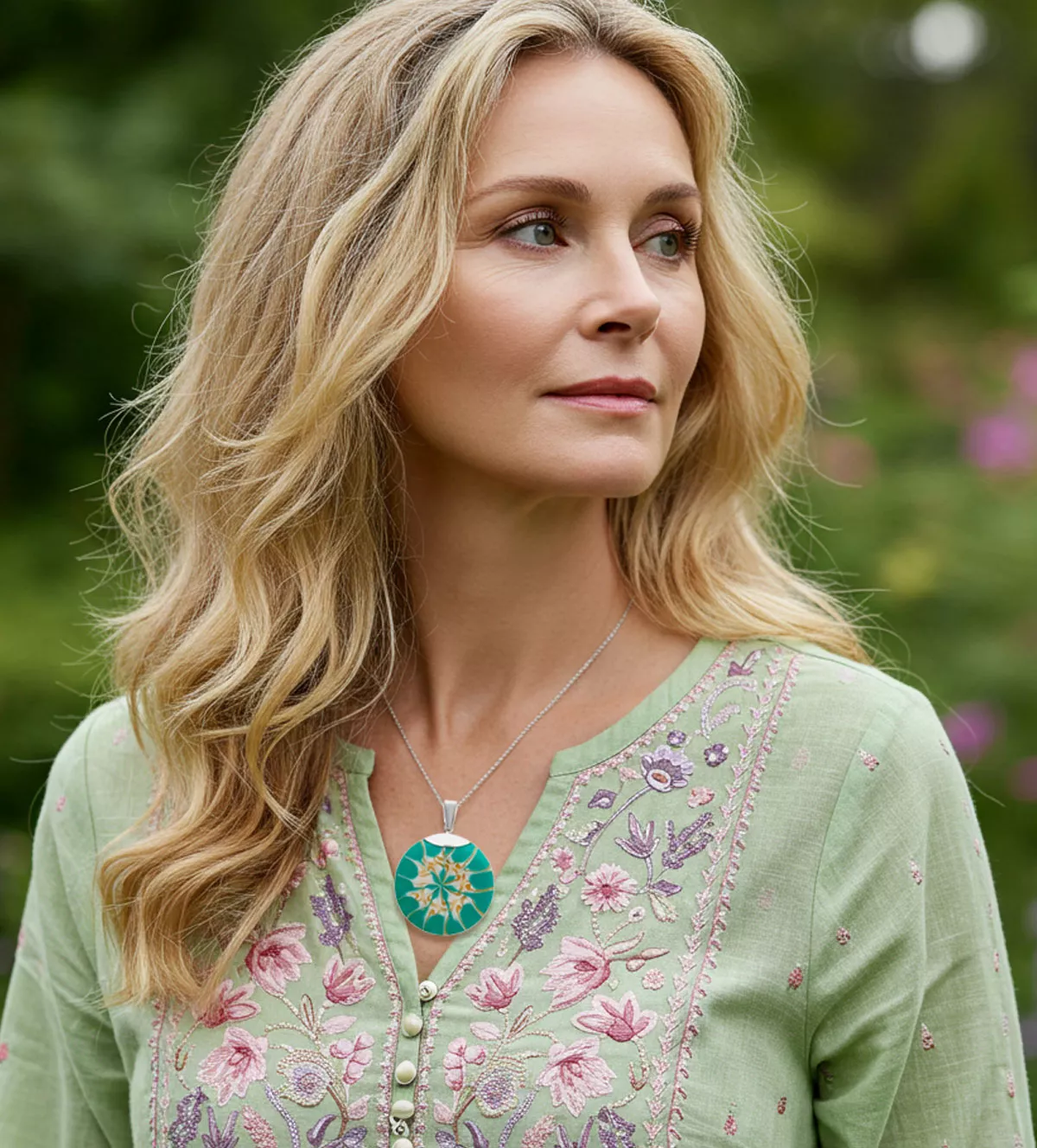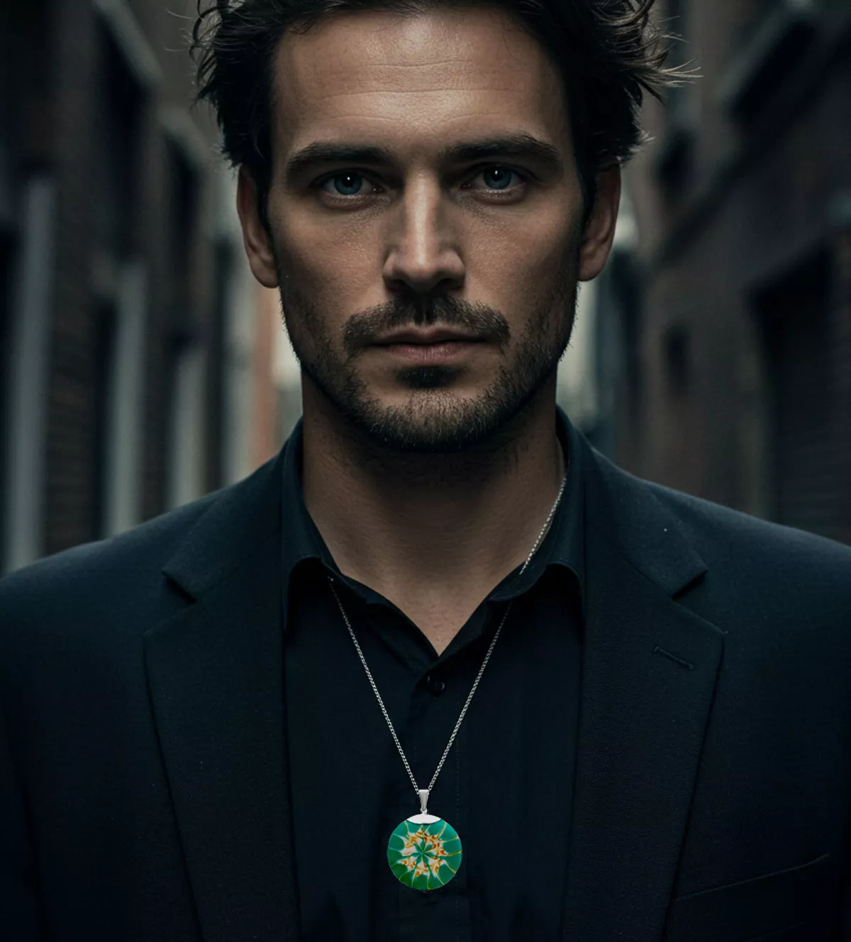 El diseño de este colgante de plata es lo que realmente lo hace destacar. Su forma circular, combinada con un asa tipo escudo, crea un equilibrio perfecto entre modernidad y simbolismo ancestral. La combinación de colores y el contraste de texturas convierten esta joya en una obra de arte versátil, ideal para quienes buscan un toque diferente.