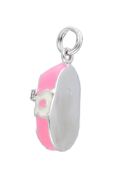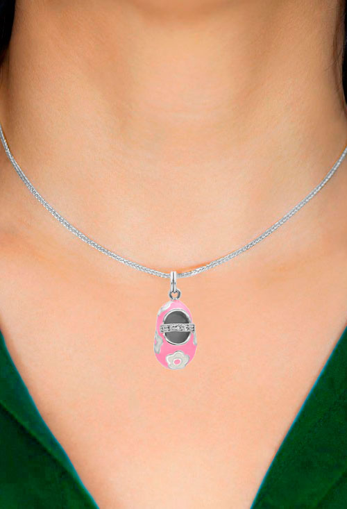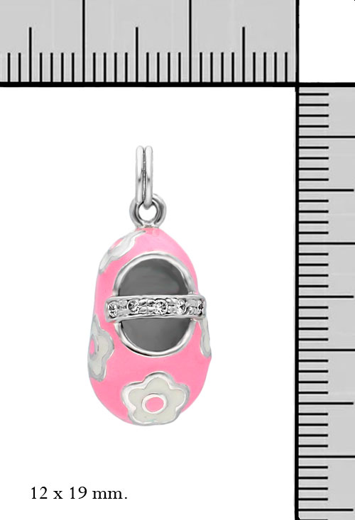 Colgante plata ley 925 milésimas que representa el patuco o zapatito de un bebé, regalo especial para las mamas el modelo que esta realizado con todo lujo de detalles esta esmaltado en colores rosas y blancos, mide 12×19 milímetros y pesa 4 gramos.