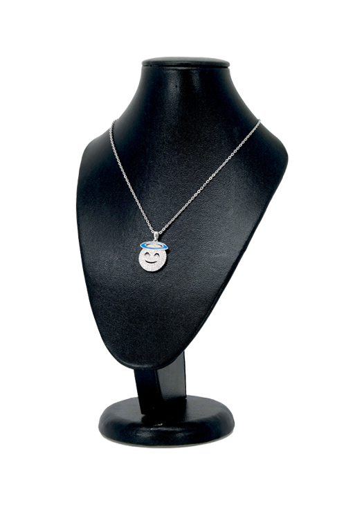 Gargantilla en acero plata y circonitas emoticono santo, 15mm en plata cuajado de circonitas y acabado con esmalte, hoy sale de su plataforma virtual para convertirse en colgante físicos que puedas llevar y mostrar a la gente tu estado, incluye cadena en acero brillante de 50cm de largo, un original regalo para el día de los enamorados