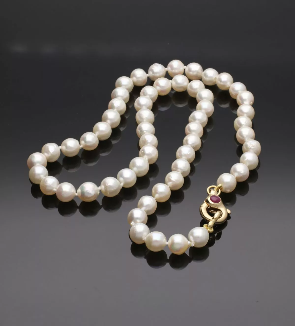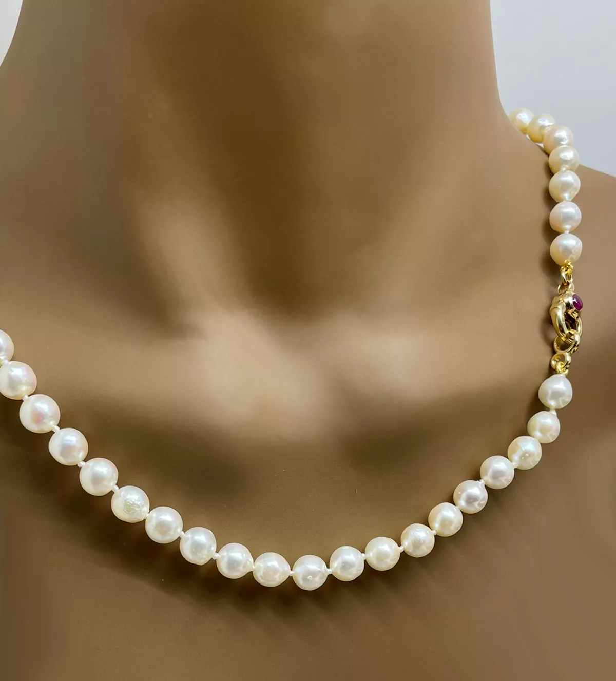 Elegante collar de perlas cultivadas (7-7.5 mm) con broche de mosquetón de oro de primera ley y rubíes. Un toque de distinción para la mujer actual.