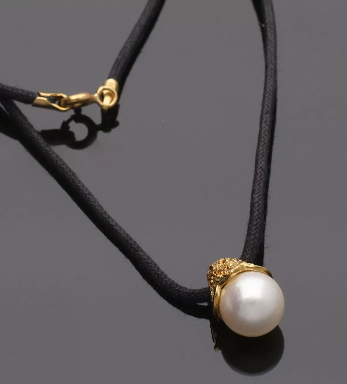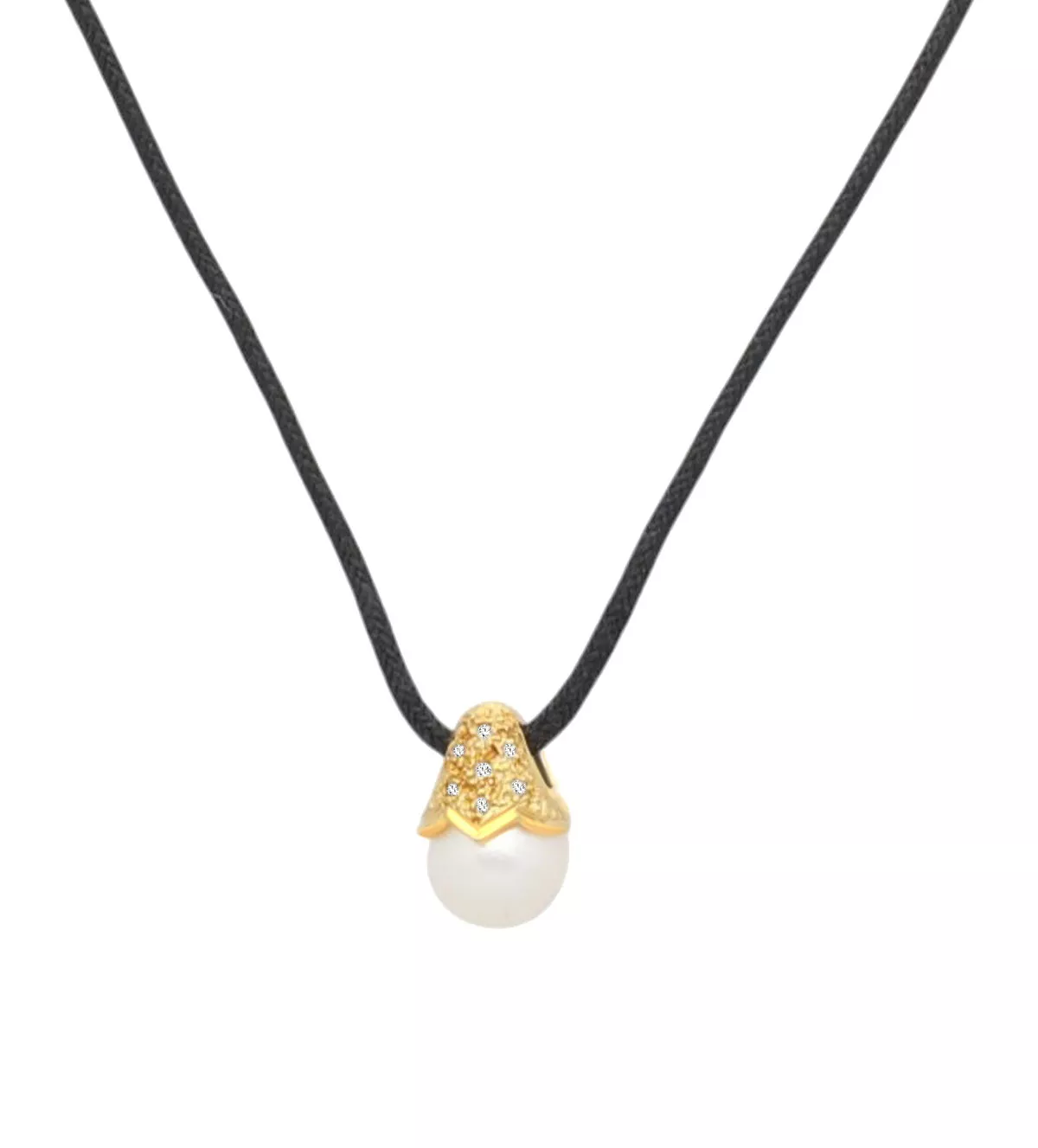 El diseño de esta gargantilla destaca por su armonía entre tradición y modernidad. El motivo principal, compuesto por la perla y el capuchón engastado con diamantes, crea una estética sofisticada. Este conjunto cuelga de un cordón de cuero negro con terminales en oro amarillo, un detalle que añade un contraste moderno y versátil. La posibilidad de sustituir el cordón por una cadena permite personalizar la pieza según el estilo de quien la lleve.