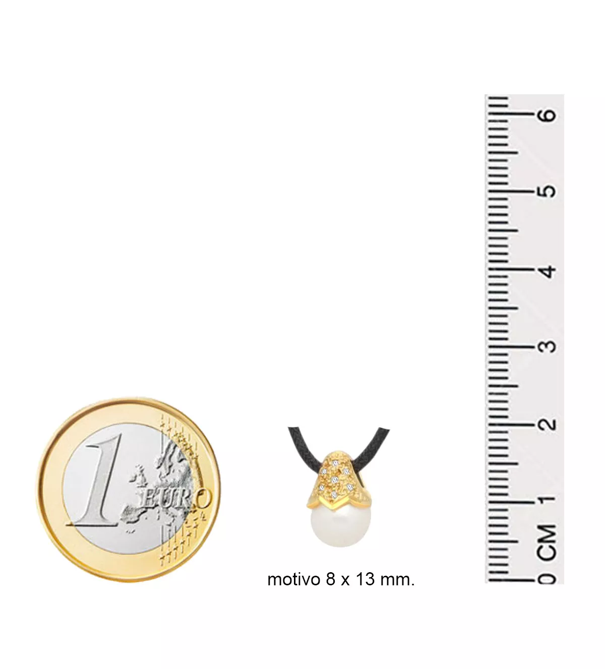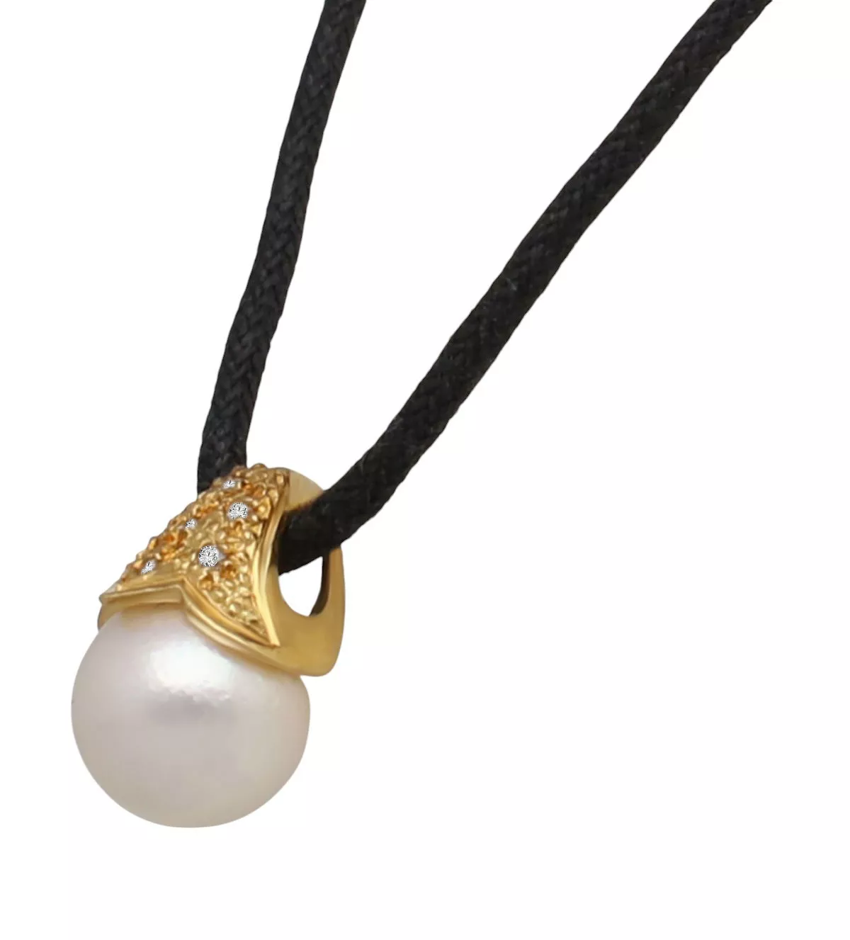 El dije pesa 1,80 gramos, lo que lo hace ligero y cómodo de usar. El cordón de cuero asegura un ajuste perfecto al cuello, con una longitud ideal para lucir la perla y los diamantes en toda su magnificencia.