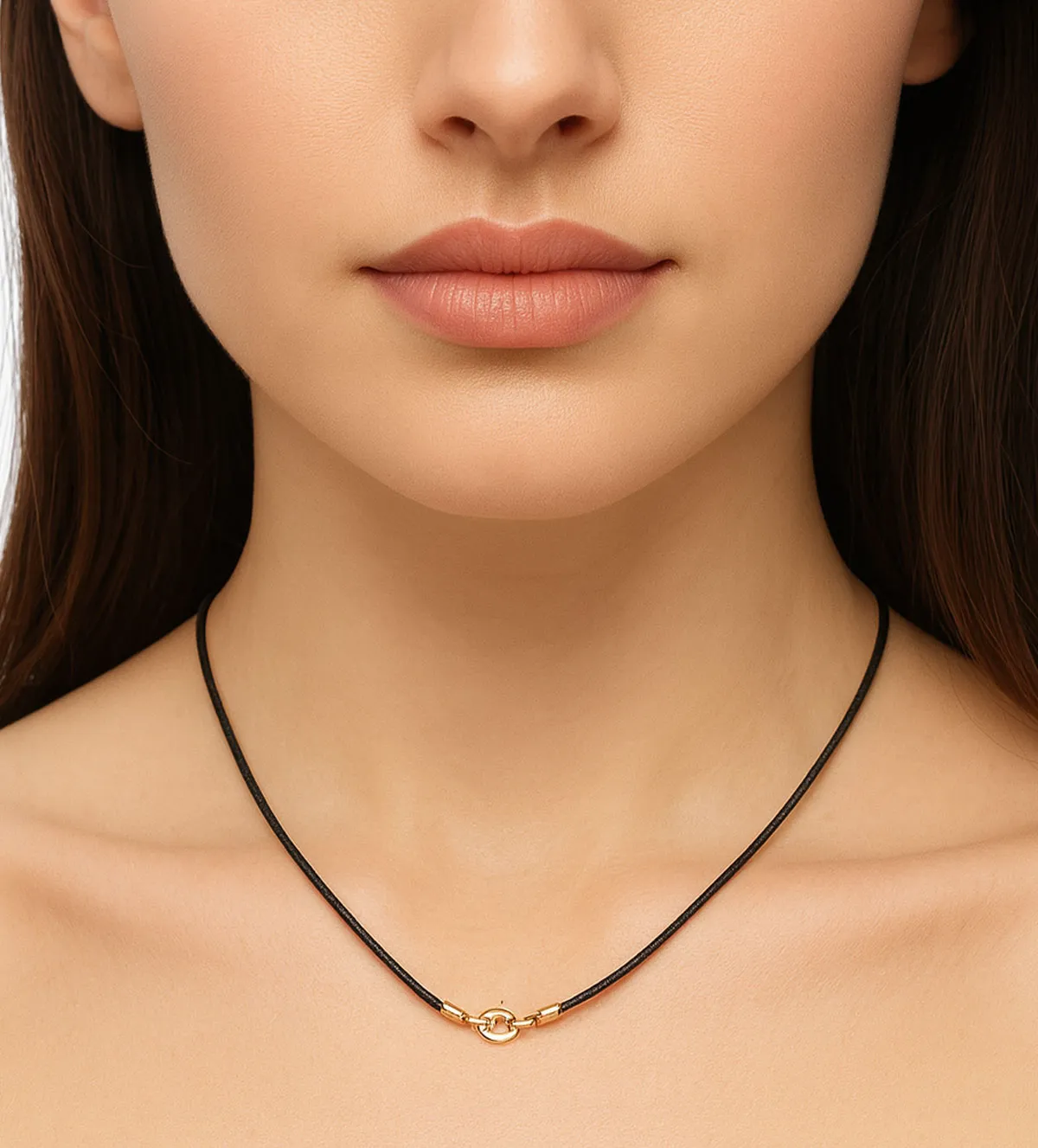 Este diseño minimalista realza la belleza de cualquier colgante o dije que decidas añadir. El contraste entre el negro del algodón y el dorado del oro crea un equilibrio visual elegante y moderno.