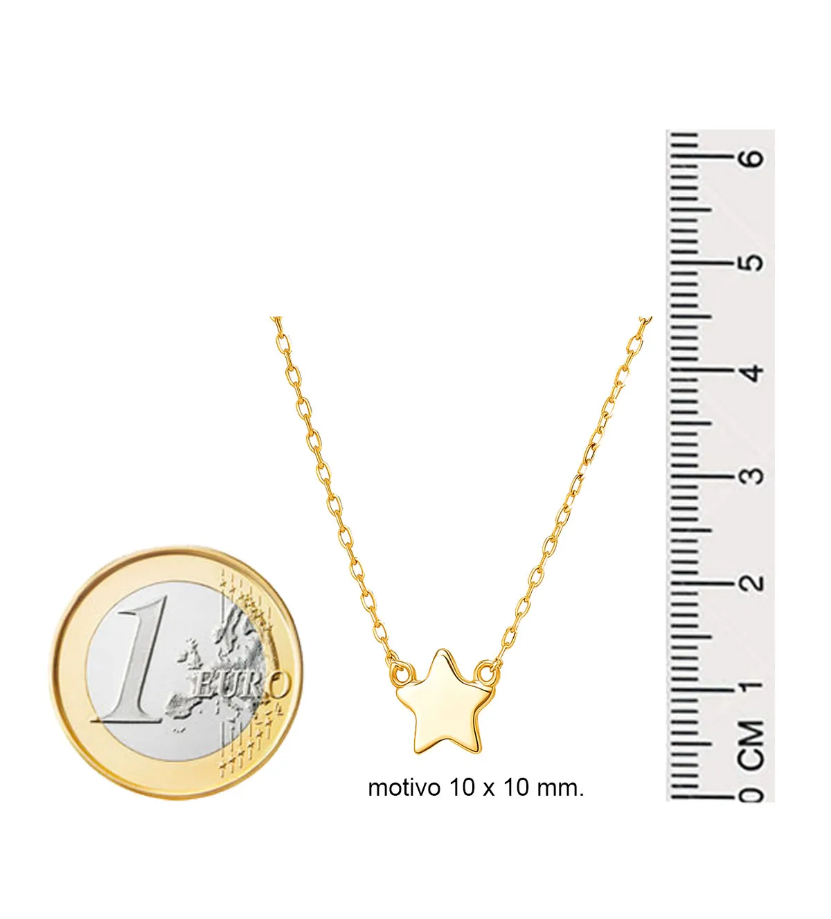 El motivo central en forma de estrella mide 10 x 10 milímetros, logrando un equilibrio perfecto entre sutileza y presencia. Su diseño minimalista, acompañado de una cadena de eslabón forzado, realza la figura de la mujer y aporta un toque de frescura y modernidad.