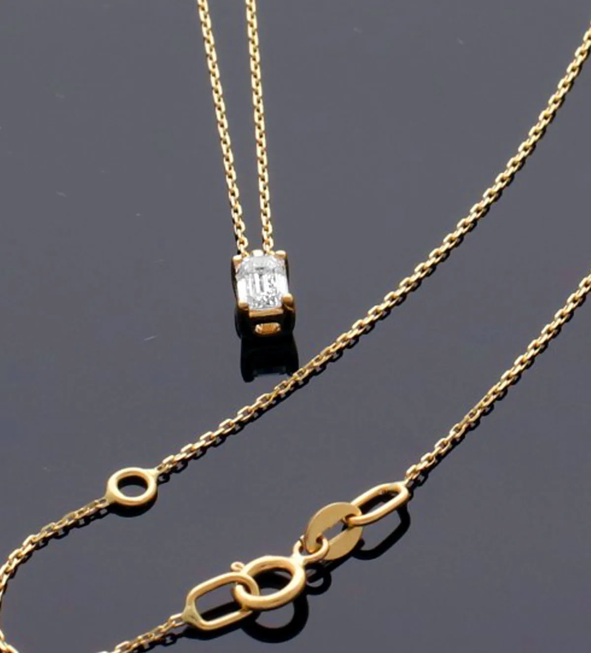 Gargantilla de oro que demuestra que el verdadero lujo está en los pequeños detalles. Realizada en oro amarillo de alta calidad con diamante natural talla esmeralda, su diseño minimalista transmite elegancia, buen gusto y distinción absoluta. Una joya exclusiva y atemporal que realza tu estilo con sutileza y brillo natural. Apuesta por la calidad y la excelencia en una pieza única pensada para durar. Disponible para envío inmediato.