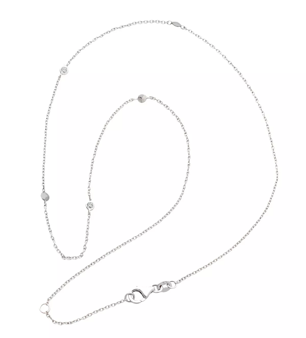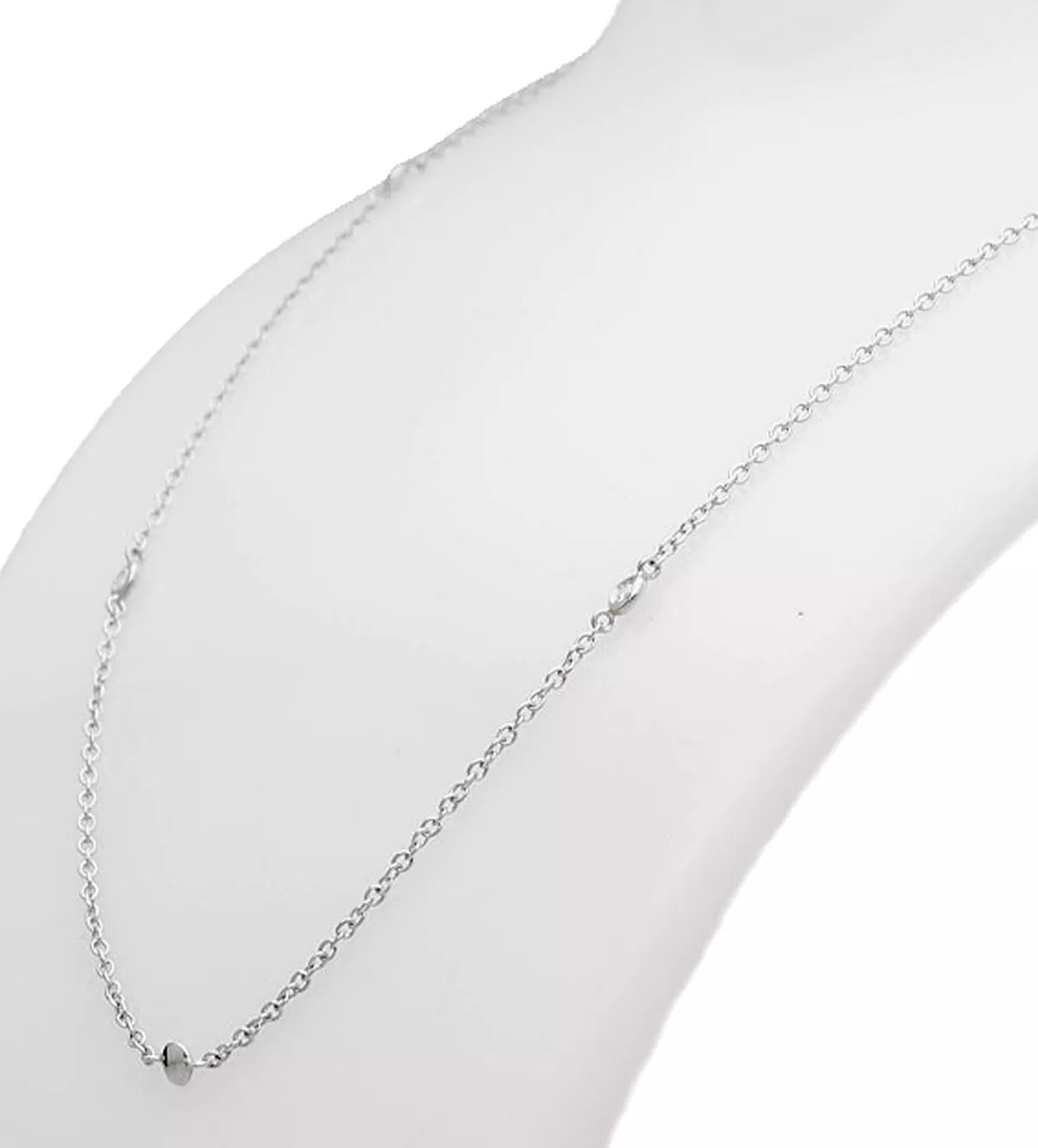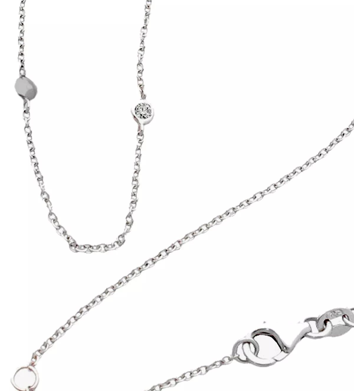 Las entrepiezas y chatones están equidistantemente distribuidos a lo largo de la cadena, asegurando un diseño equilibrado y armonioso. Cada pieza tiene un tamaño de 3 mm, lo que añade un toque de brillo sutil pero notable.