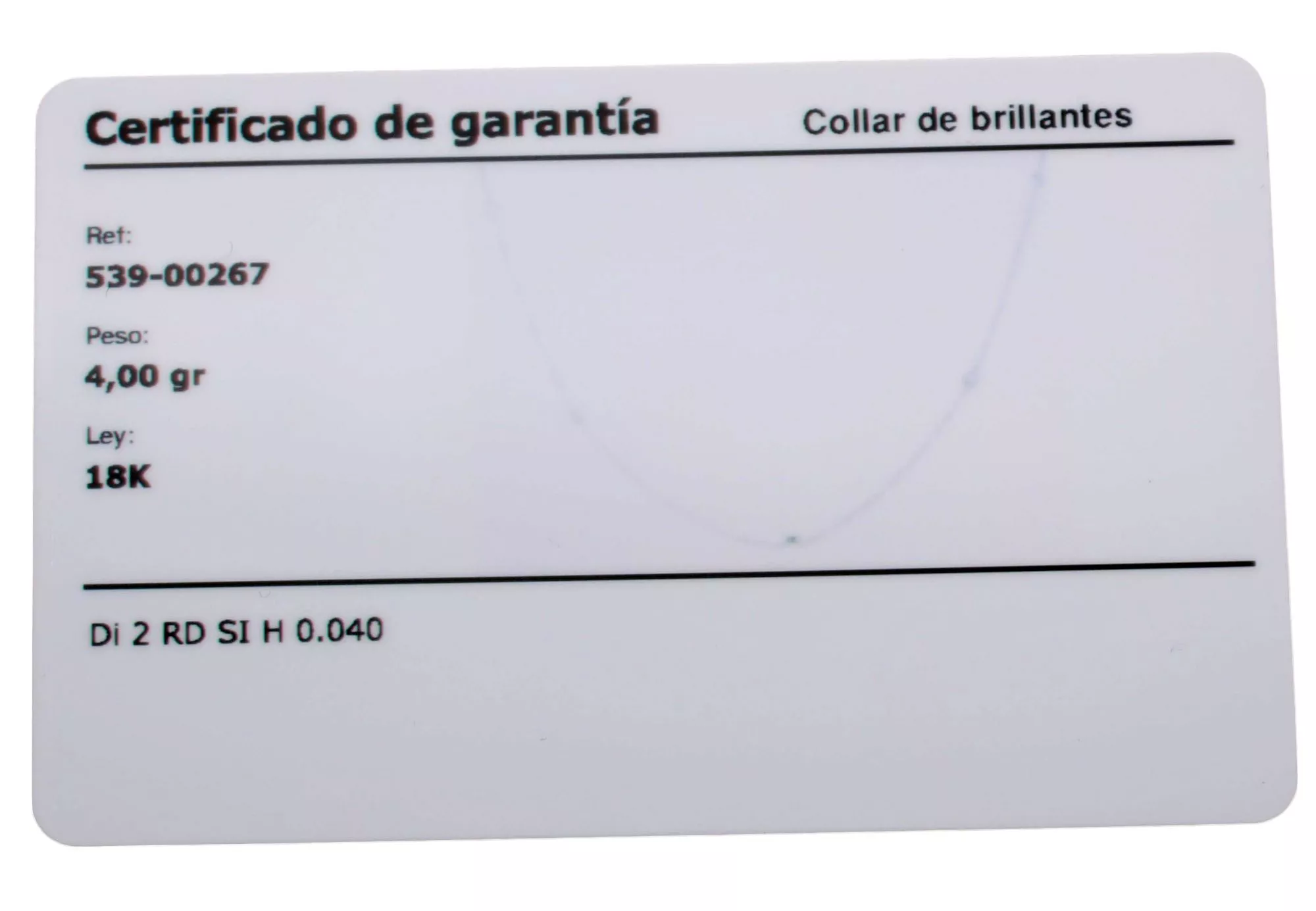 Los brillantes engastados en la gargantilla tienen un peso total de 0,04 ct, con un color H y una pureza SI. Estas características aseguran un brillo excepcional y una claridad que destaca en cualquier situación.