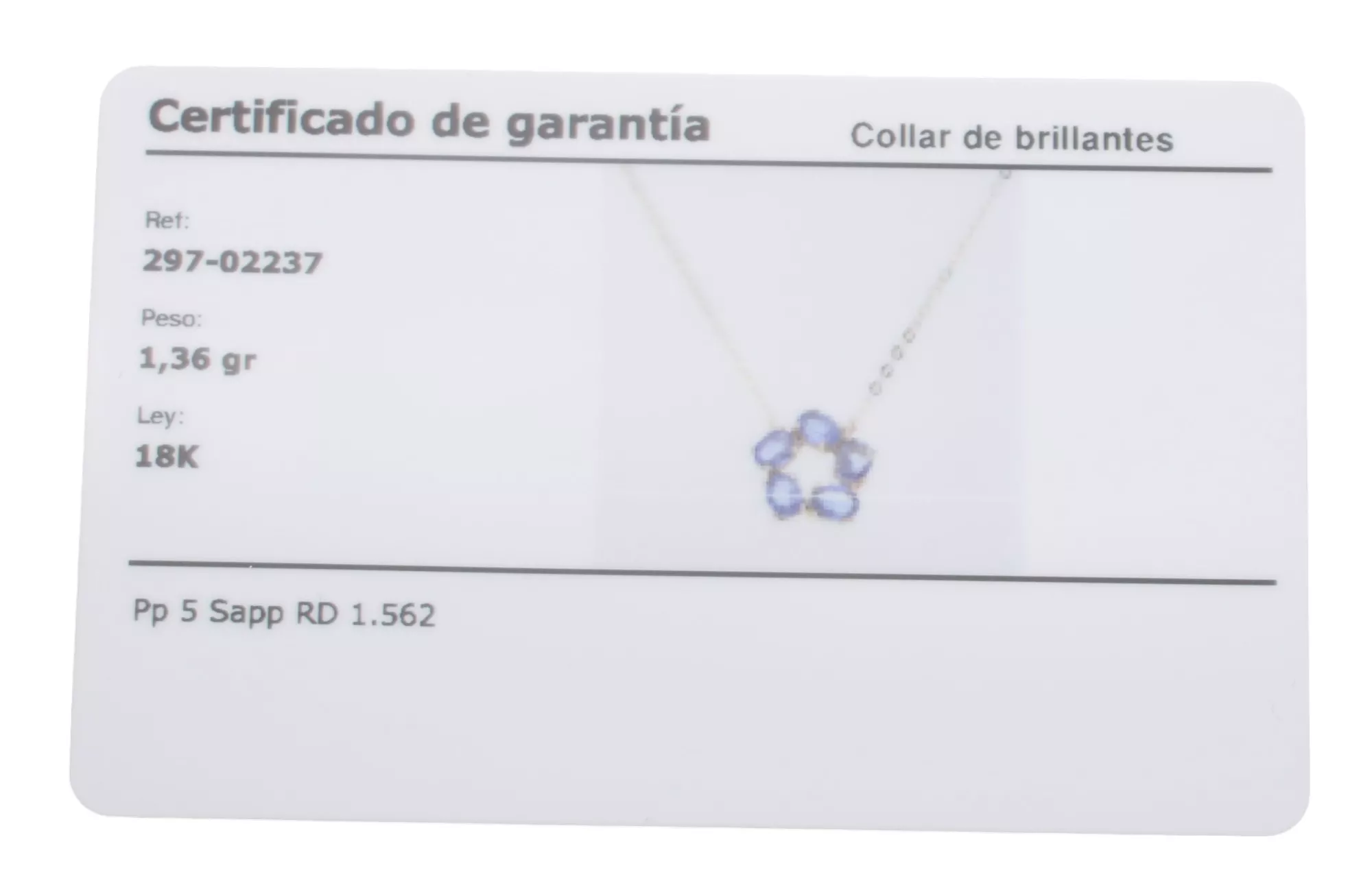 | Características Piedras | 5 zafiros finos de talla ovalada de aproximadamente 0,30 ct. cada uno, peso total 1,562 ct. |