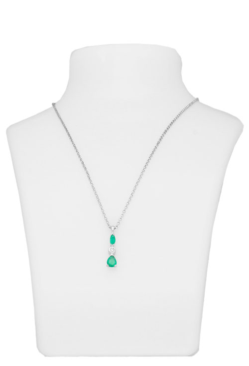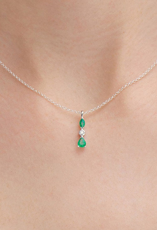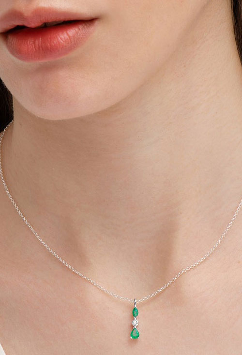 Este inspirador colgante está elaborado con plata de Ley 925 y luce un diamante natural de calidad Top Wesselton de 1,5 mm. y dos esmeraldas naturales procedentes de Colombia, una de ellas de talla pera y la otra de talla marquis, consiguiendo así ese diseño elegante y alargado.