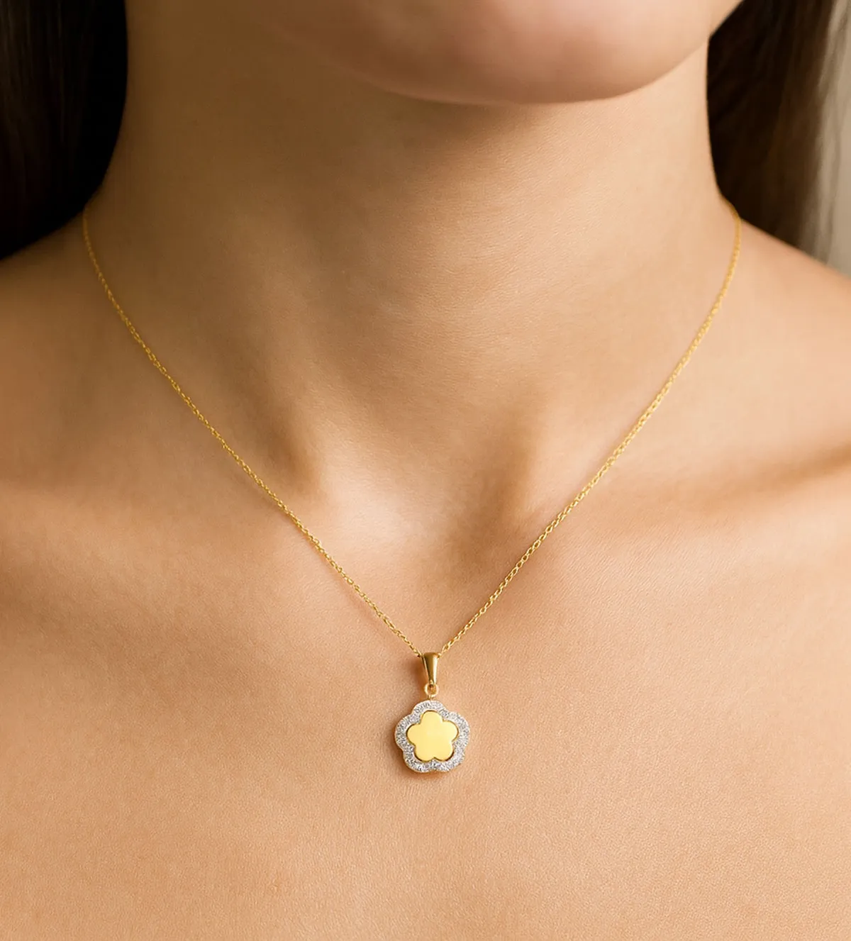 La flor es un símbolo universal de belleza, vida y feminidad. Al estar rodeada de cristales, esta gargantilla de oro transmite luz, energía positiva y armonía. Es un detalle perfecto para regalar en cumpleaños, aniversarios o momentos especiales, ya que simboliza cariño, amor y renovación.