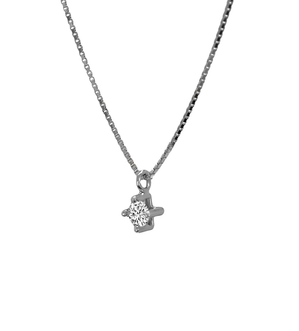 Gargantilla de oro blanco 18k con diamante talla brillante de 0,06 ct, color H y pureza VS. Su cadena de eslabones venecianos es fina y elegante, ajustable a 40 o 45 cm, con cierre reasa. La garra de 4 patas sostiene un brillante engastado, creando un detalle sutil y sofisticado ideal para novias o para cualquier ocasión. Una joya delicada y versátil que resalta el cuello femenino con elegancia. Disponible en stock para envío inmediato en Rubí Joyeros.