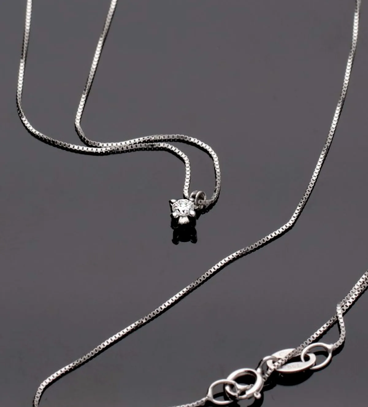 El colgante es una delicada garra de 4 patas que sostiene un diamante talla brillante de 0,06 quilates, cuidadosamente engastado para maximizar su brillo. Este diamante posee una calidad excepcional: